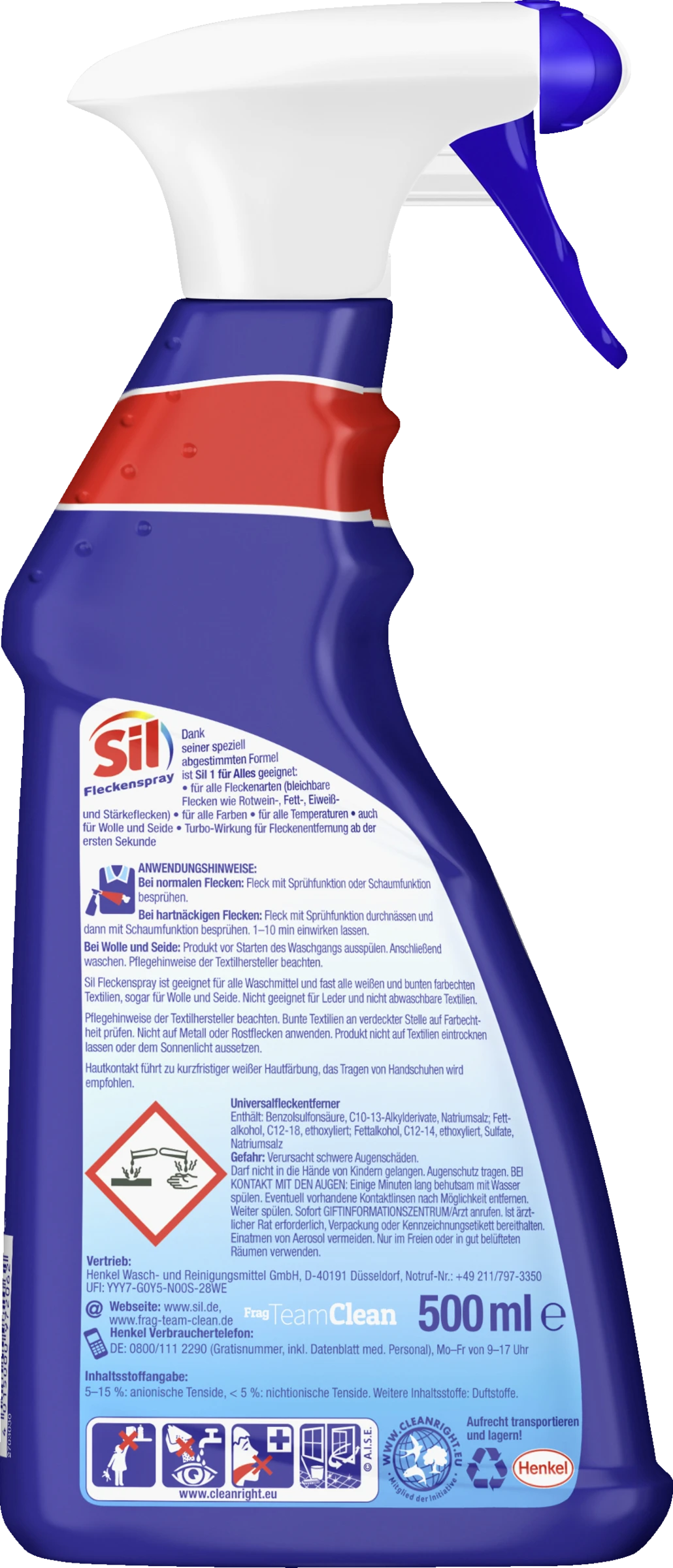 Sil 1 für Alles Fleckenspray ist ein vielseitiger Universal-Fleckenentferner für Ihre Wäsche. Mit Hilfe der einzigartigen Kombidüse mit Spray- und Schaumfunktion können Sie Flecken gezielt vorbehandeln. Durch die verbesserte Formel können Flecken mit Turbowirkung ab der ersten Sekunde entfernt werden.