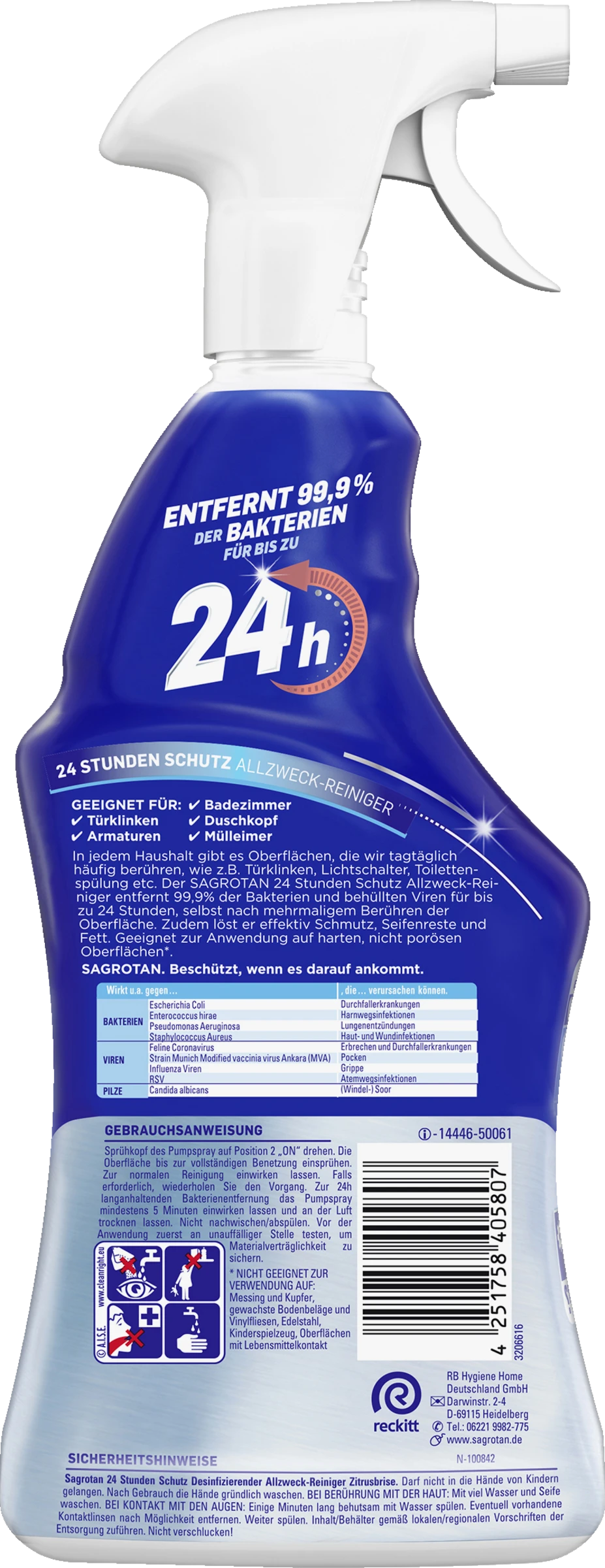 In jedem Haushalt gibt es Oberflächen, die wir tagtäglich häufig berühren, wie z.B. Türklinken, Lichtschalter, Toilettenspülung etc. Der SAGROTAN 24 Stunden Schutz desinfizierender Allzweck-Reiniger entfernt 99,9% der Bakterien und behüllten Viren für bis zu 24 Stunden lang, selbst nach mehrmaligem Berühren der Oberfläche. Der Reiniger bietet eine ideale 2in1 Lösung, denn er desinfiziert und löst effektiv Schmutz, Seifenreste und Fett. Geeignet zur Anwendung auf harten, nicht porösen Oberflächen im ganzen Haus. SAGROTAN. Beschützt, wenn es darauf ankommt.