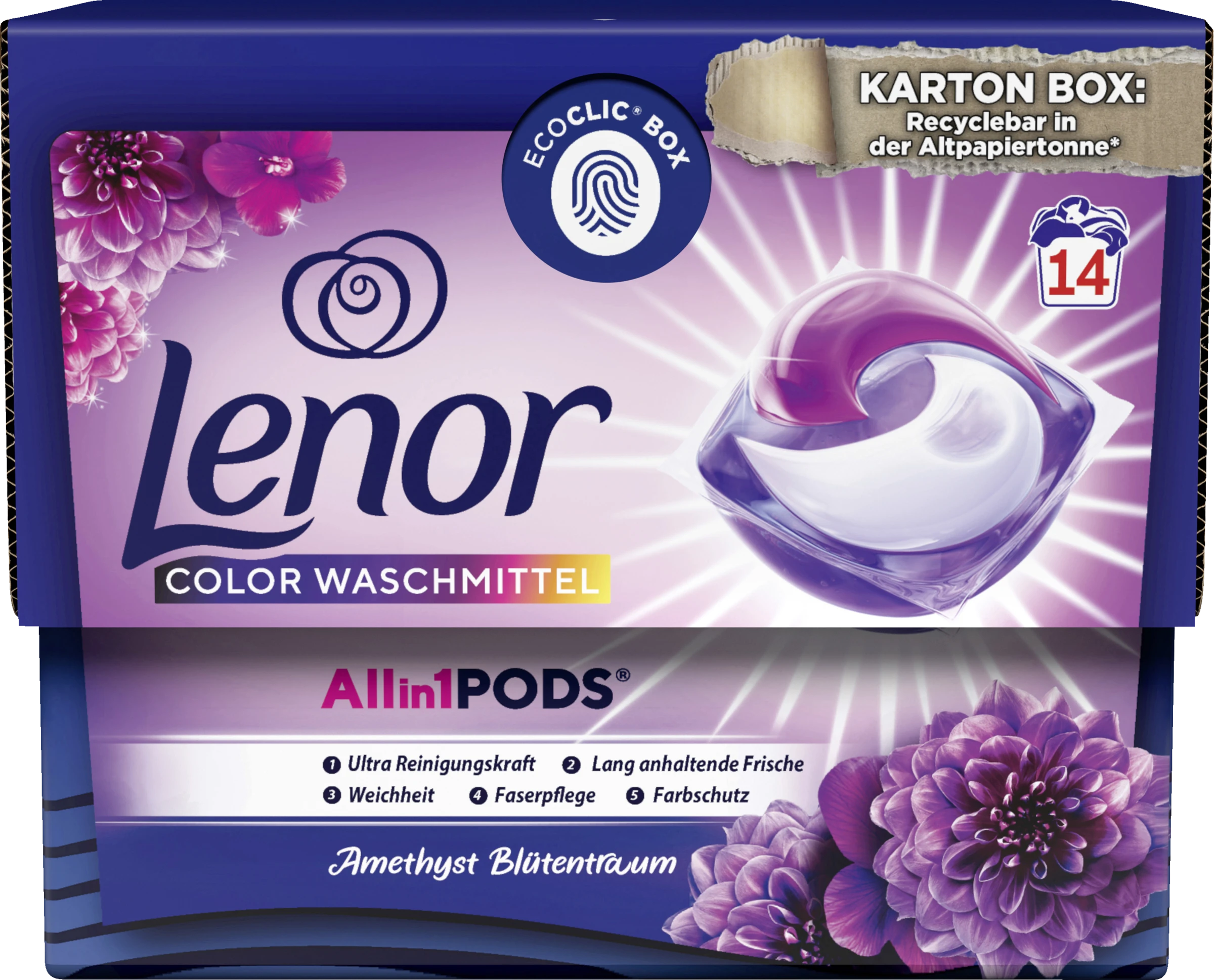 Testen Sie Lenor Waschmittel Allin1 PODS® Amethyst Blütentraum in einer recyclebaren KARTON BOX. Mit Ultra Reinigungskraft für hygienische Tiefenreinheit und lang anhaltende Frische.