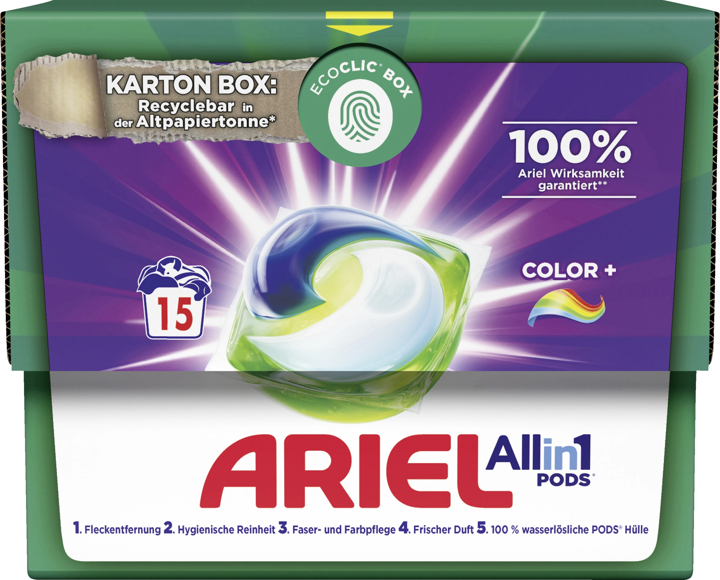 Ariel All-in-1 PODS® Waschmittelkapseln Color+ bieten ab der ersten Wäsche ausgezeichnete Fleckentfernung bei niedrigeren Wassertemperaturen. Sie wurden speziell für niedrige Wassertemperaturen entwickelt und verfügen über einzigartige Technologien, wie die Cool-clean-Technologie.