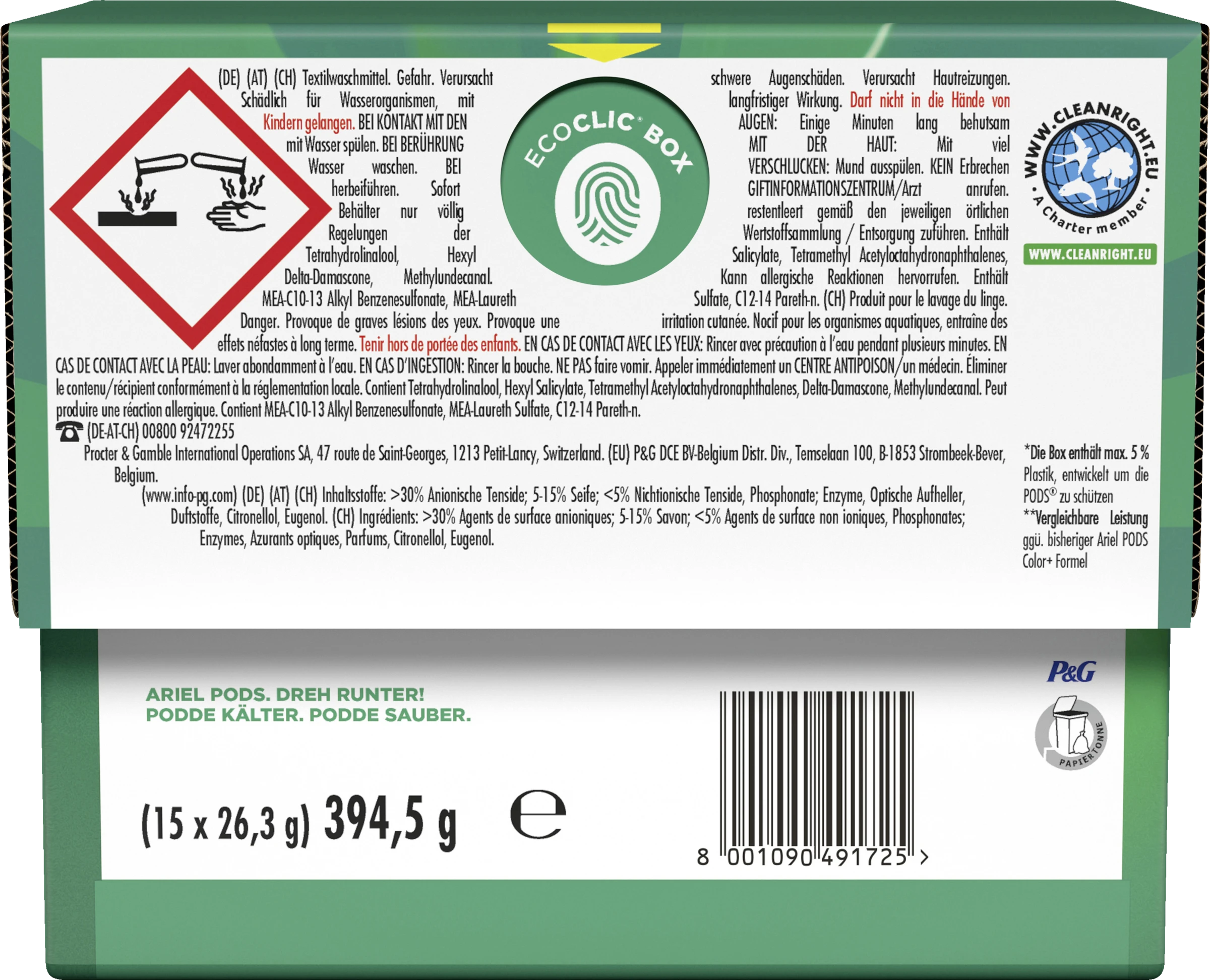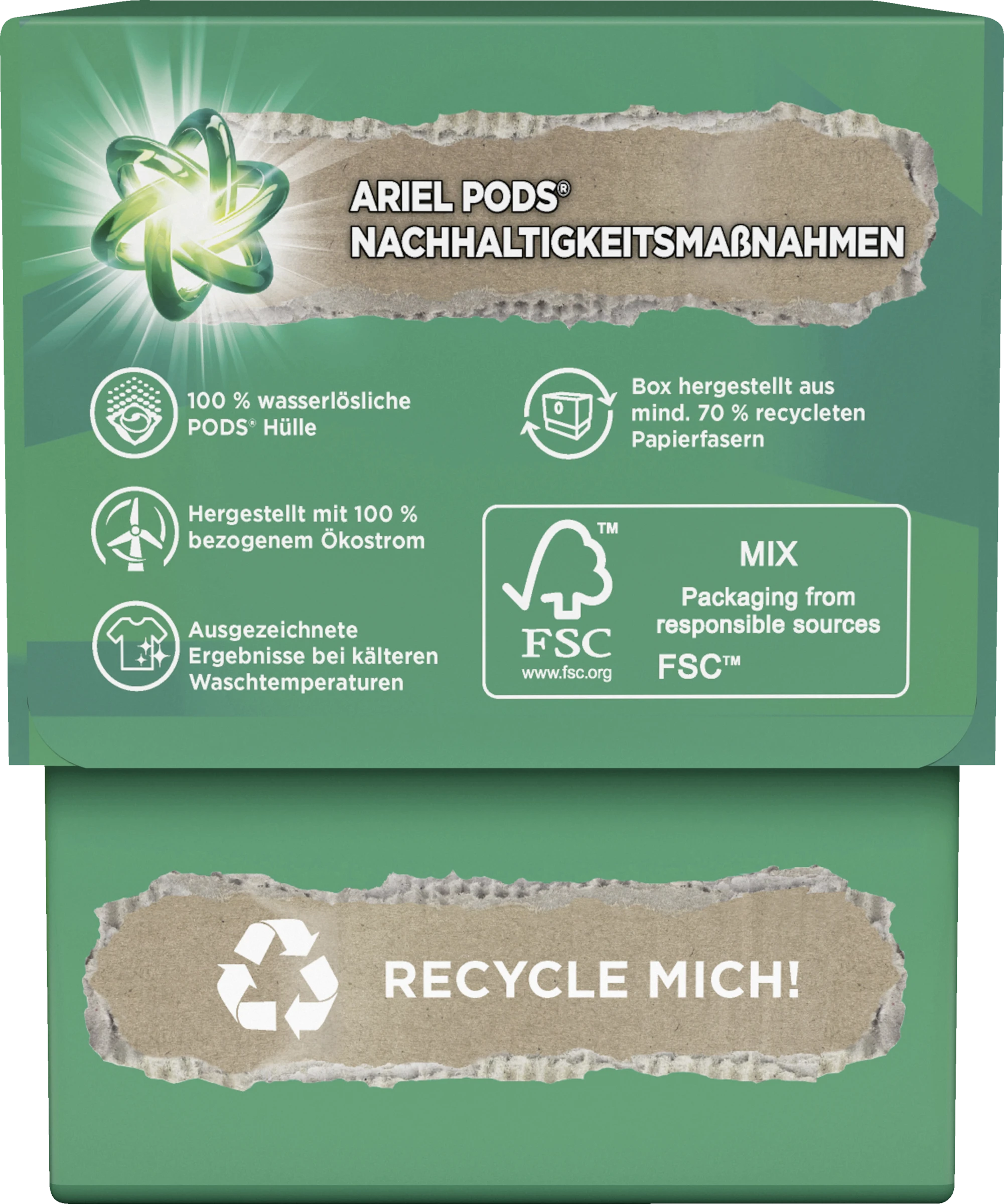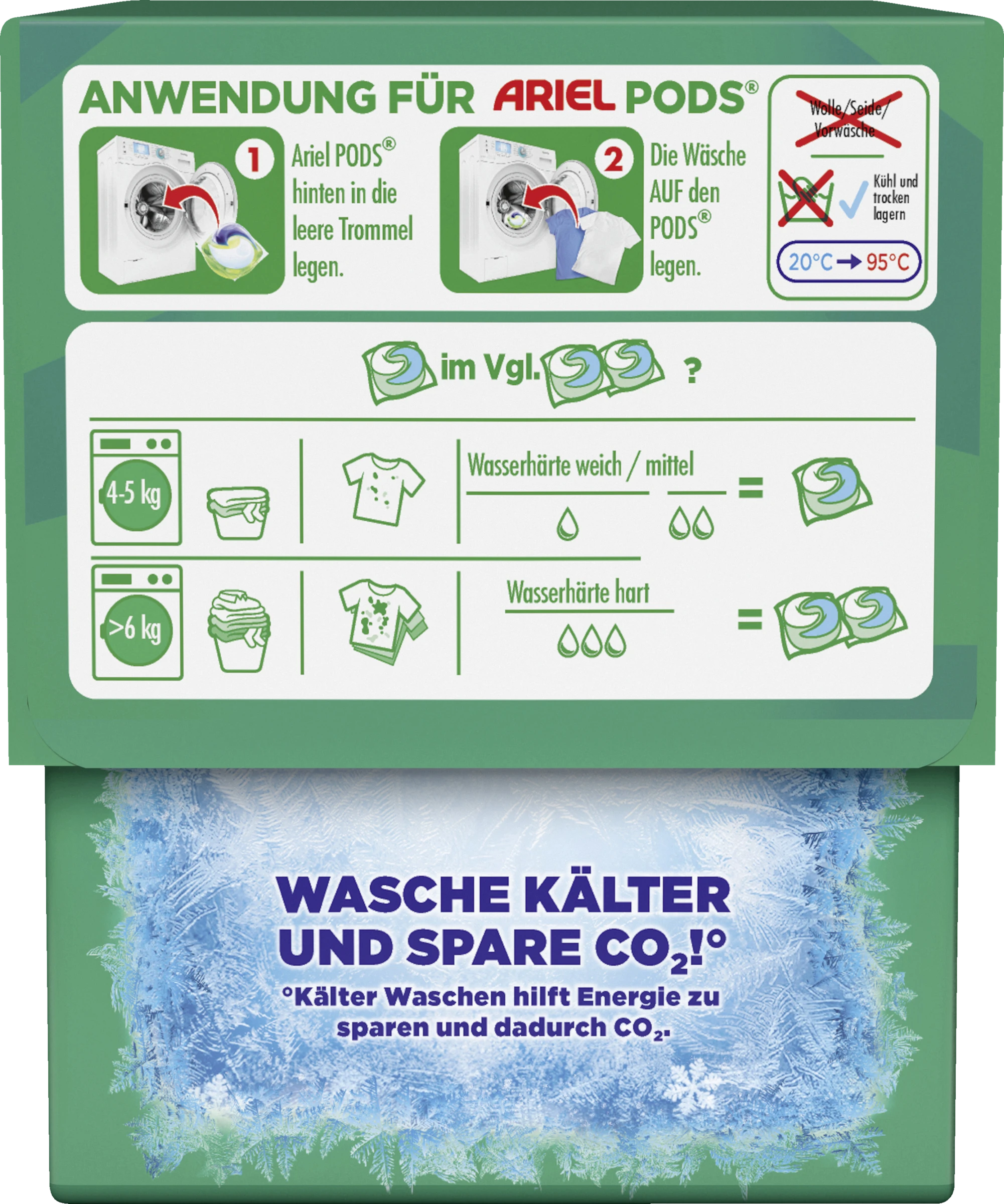 Ariel POD hinten in die leere Trommel legen. Die Wäsche darauf legen.