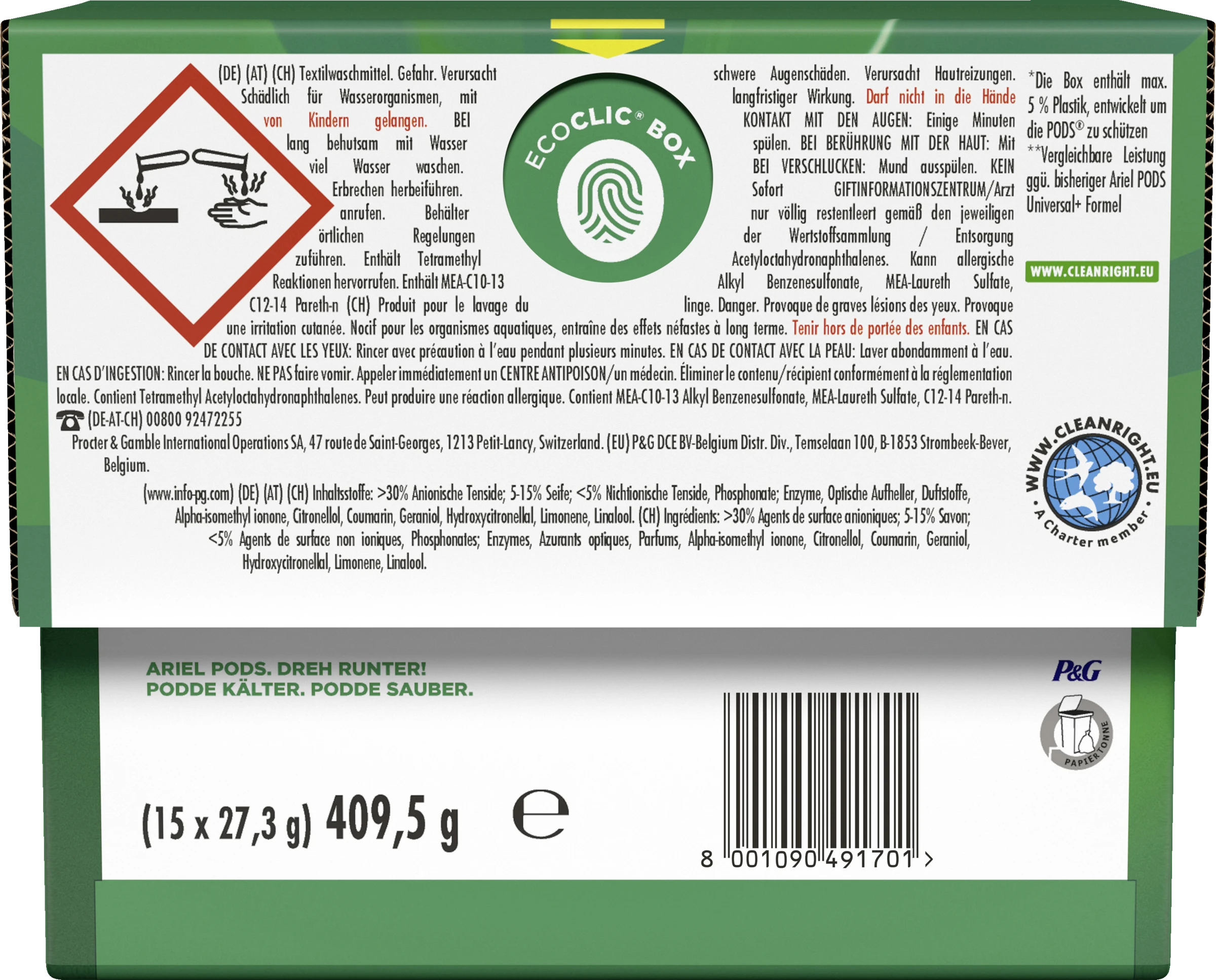 Ariel POD hinten in die leere Trommel legen. Die Wäsche auf den POD legen.