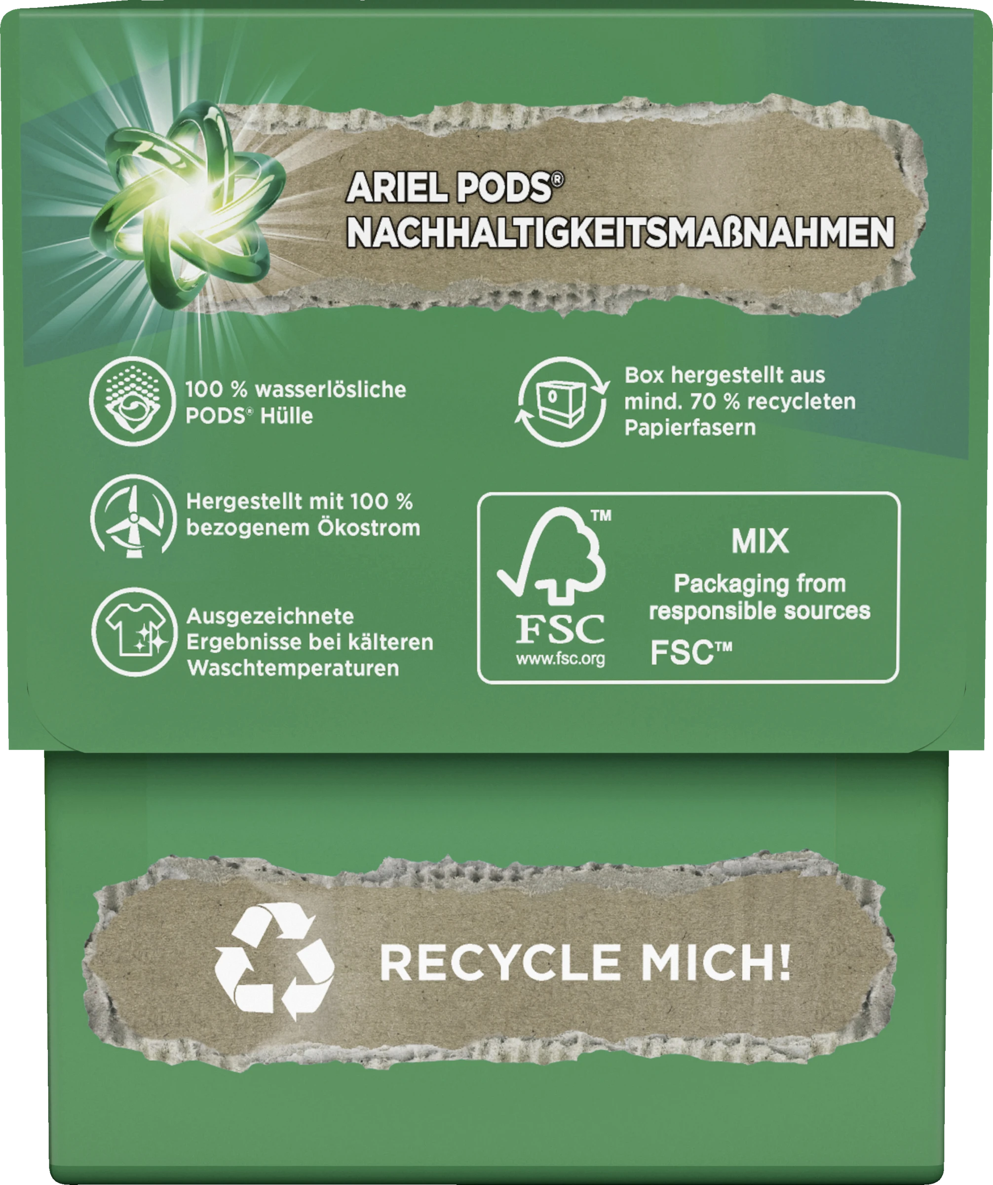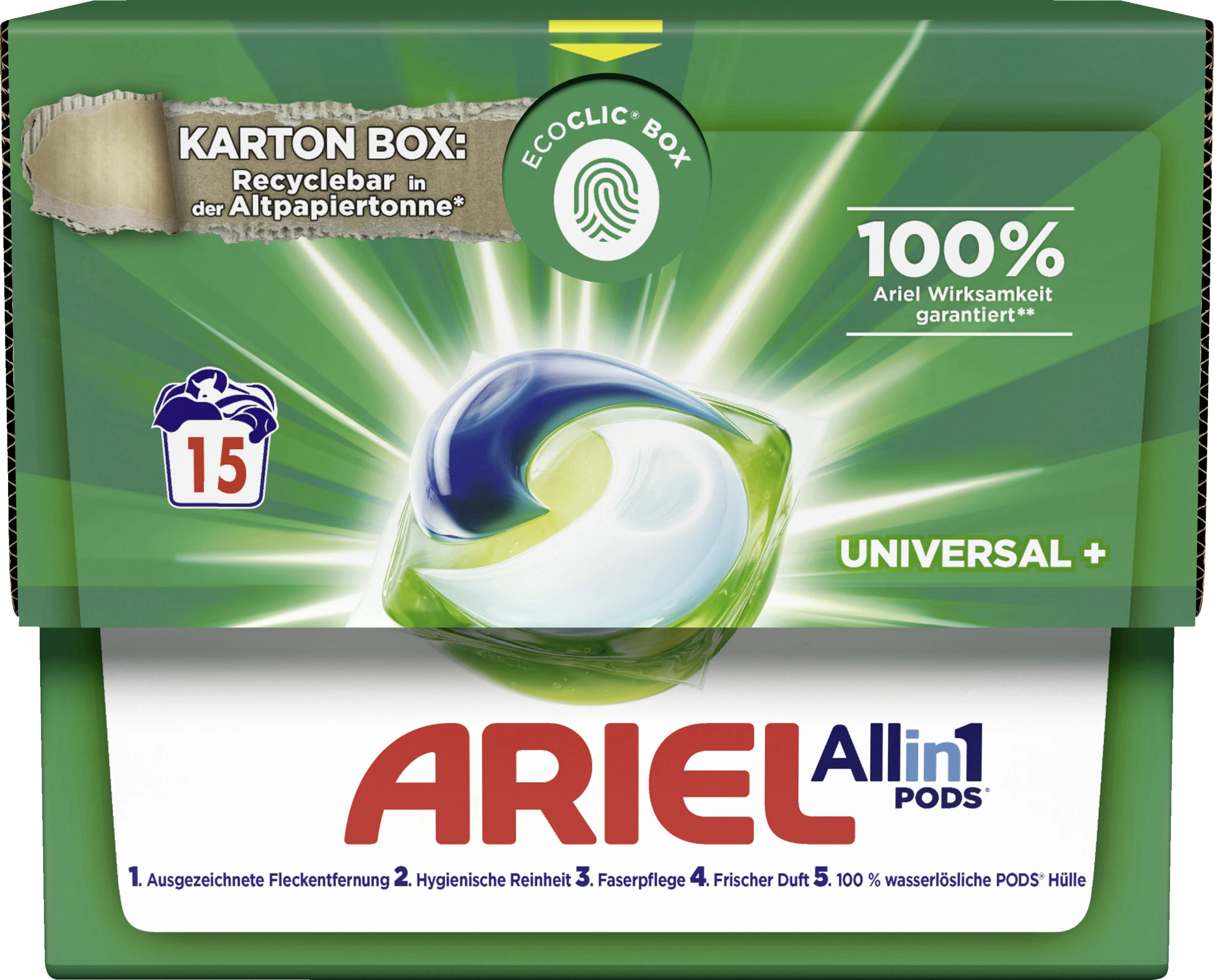 Ariel All-in1 PODS® Waschmittelkapseln Universal+ bieten ab der ersten Wäsche ausgezeichnete Fleckentfernung bei niedrigeren Wassertemperaturen. Sie wurden speziell für niedrige Wassertemperaturen entwickelt und verfügen über einzigartige Technologien, wie die Cool-clean-Technologie.