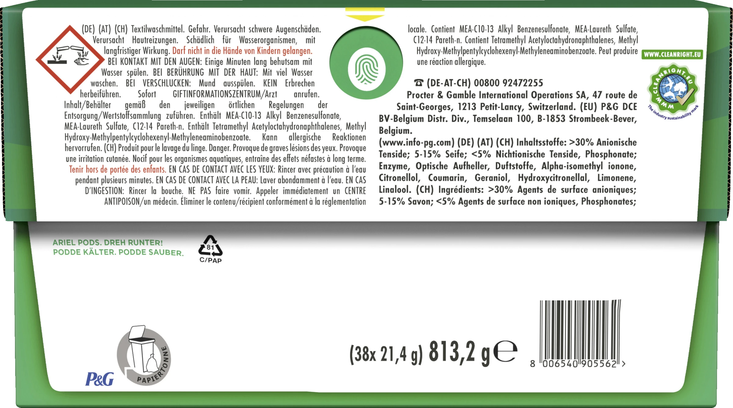 Verursacht schwere Augenschäden. Verursacht Hautreizungen. Schädlich für Wasserorganismen, mit langfristiger Wirkung. Darf nicht in die Hände von Kindern gelangen. BEI KONTAKT MIT DEN AUGEN: Einige Minuten lang behutsam mit Wasser spülen. BEI BERÜHRUNG MIT DER HAUT: Mit viel Wasser waschen. BEI VERSCHLUCKEN: Mund ausspülen. KEIN Erbrechen herbeiführen. Sofort GIFTINFORMATIONSZENTRUM/Arzt anrufen. Enthält MEA-C10-13 Alkyl Benzenesulfonate, MEA-Laureth Sulfate, C12-14 Pareth-n. Enthält Tetramethyl Acetyloctahydronaphthalenes, Methyl Hydroxy-Methylpentylcyclohexenyl-Methyleneaminobenzoate. Kann allergische Reaktionen hervorrufen. Mit trockenen Händen verwenden. Nicht einstechen, aufreißen oder zerschneiden. Weitere Informationen findest du auf keepcapsfromkids.eu.
