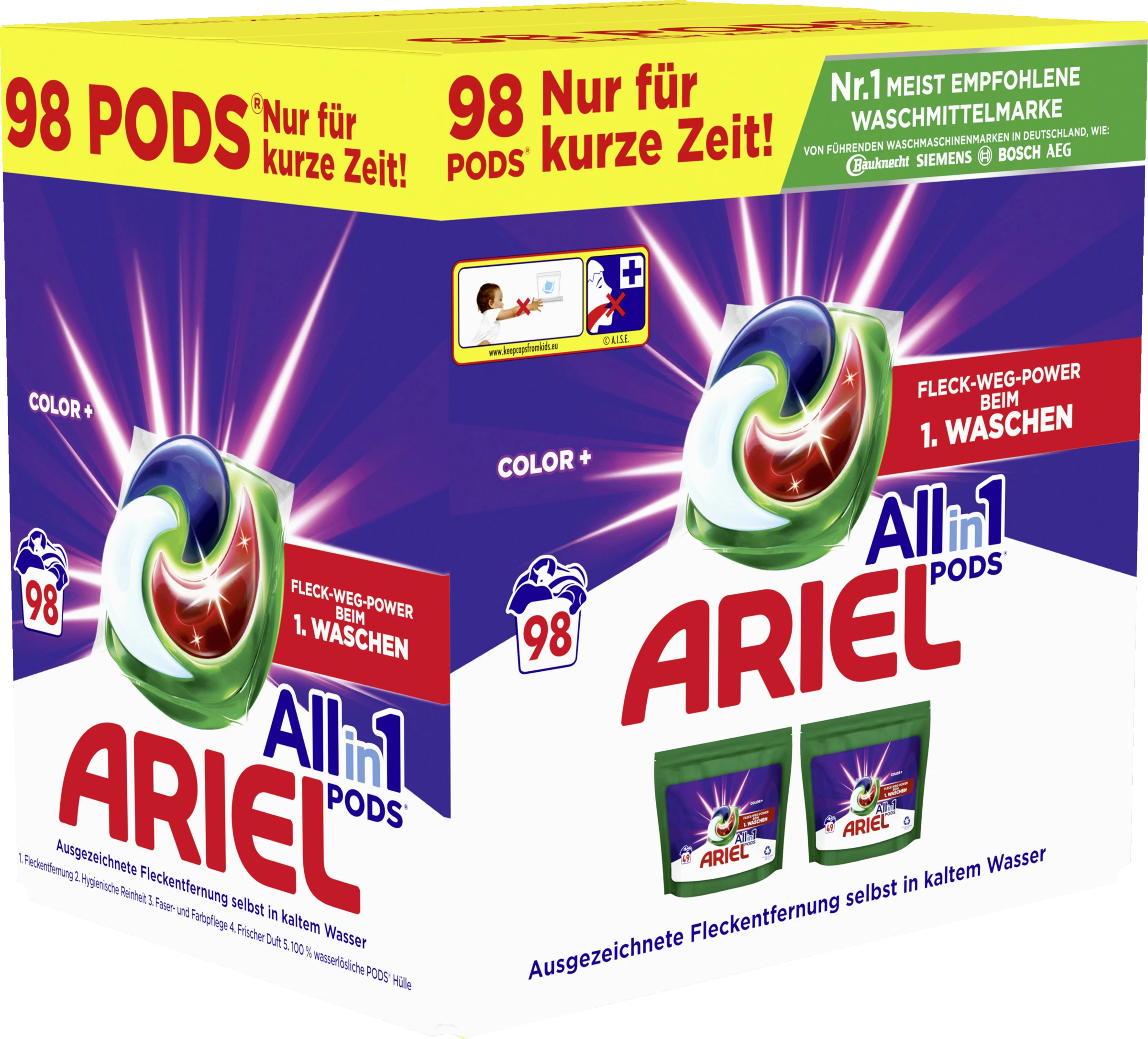 Entdecke Ariel, die Nr.1 meist empfohlene Waschmittelmarke von führenden Waschmaschinenmarken in Deutschland, wie: Bauknecht SIEMENS BOSCH AEG. Ariel präsentiert die Allin1 PODS® Waschkapseln Color+, die jetzt mit einer zusätzlichen roten Kammer ausgestattet sind und ausgezeichnete Fleckentfernung beim 1. Waschen bieten. Sie wurden für die Kaltwäsche entwickelt und verfügen über einzigartige Technologien wie die COOL CLEAN Technologie. Wasche kälter mit Ariel Allin1 PODS® Color+: Spare Energie bei jedem Waschgang und reduziere damit die CO2-Emissionen deiner Wäsche. Darüber hinaus ist die Verpackung von Ariel Allin1 PODS® Waschkapseln zu 100 % recyclebar und kann in der gelben Tonne entsorgt werden (DE) (AT). Die zu 100 % wasserlösliche Hülle der PODS® löst sich bei Kontakt mit Wasser vollständig auf und setzt die kraftvolle Formel zur Fleckentfernung frei, die für die gründliche und starke Reinigung von Ariel Allin1 PODS® Color+ sorgt. ACHTUNG: Darf nicht in die Hände von Kindern gelangen. Verursacht schwere Augenschäden und Hautreizungen. Bewahre Ariel Allin1 PODS® Waschkapseln Waschmittel stets außerhalb der Reichweite von Kindern auf. Weitere Informationen findest du auf keepcapsfromkids.eu.