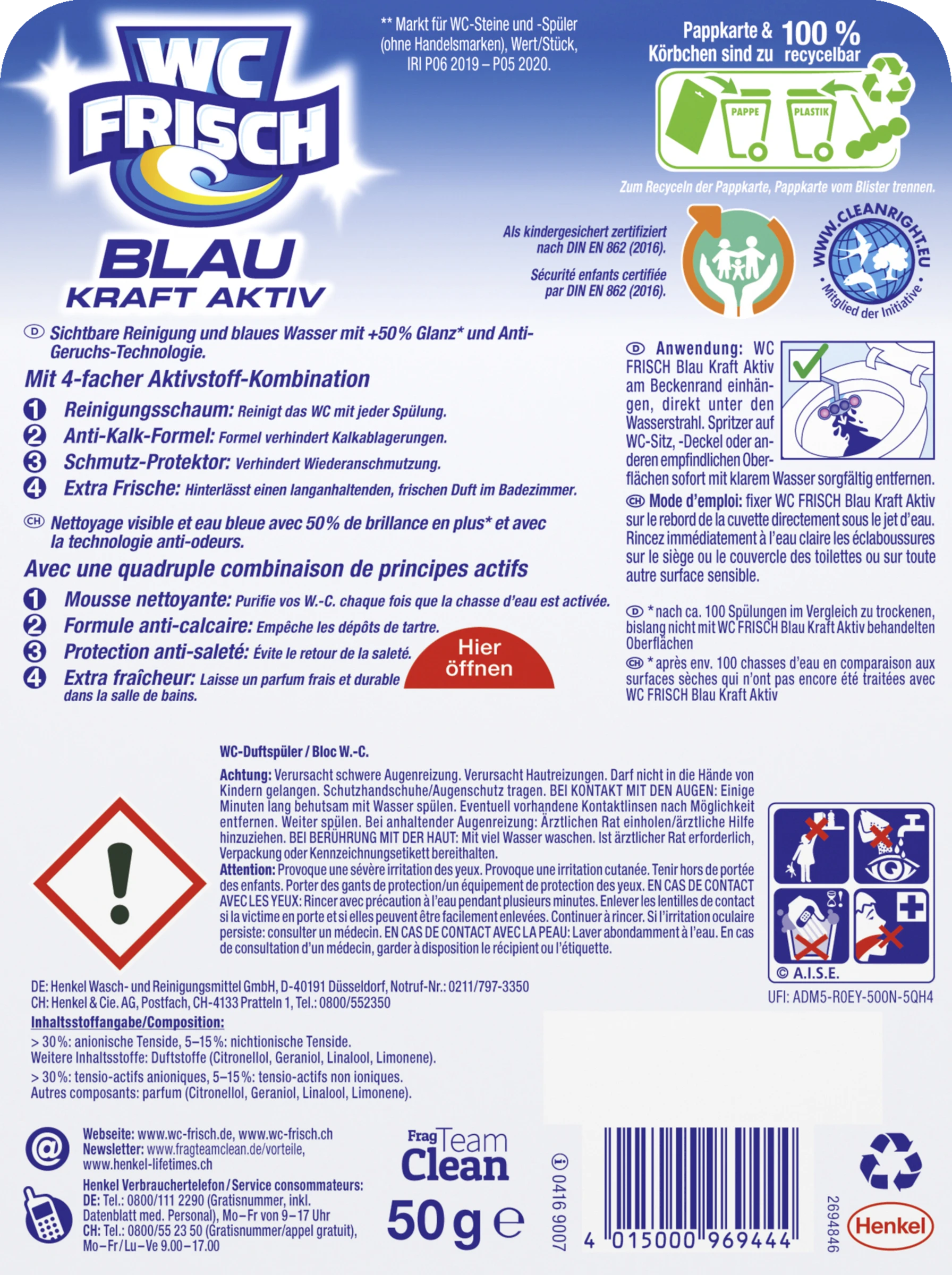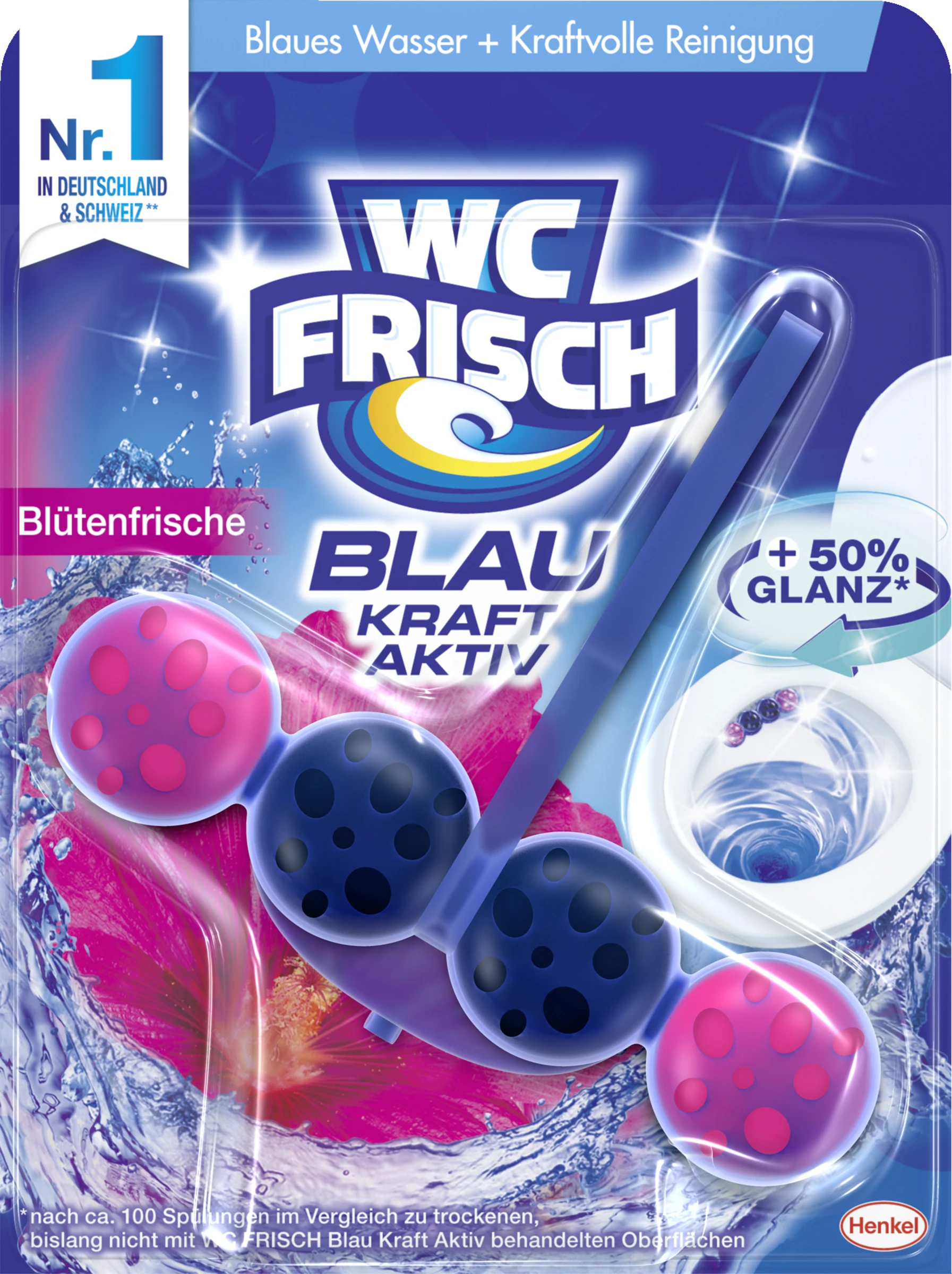 Wäre es nicht wunderbar, wenn Ihre Toilette immer sauber und frisch wie eine blaue Lagune wäre? Dank der Blaue-Wasser-Kugeln, erhält WC FRISCH Kraft Aktiv Blauspüler sichtbar die Sauberkeit und Frische Ihrer Toilette sogar zwischen den Spülungen. Aber wie? Wenn Sie spülen, sammelt das Körbchen von Kraft Aktiv Blauspüler das Wasser, reichert es mit Aktiv-Inhaltsstoffen an und lässt es am Ende der Spülung frei. Der Beweis hierfür ist das blau gefärbte Wasser, welches in Ihrer Toilette zurückbleibt: Für beste Sauberkeit und Frische sogar zwischen den Spülungen!