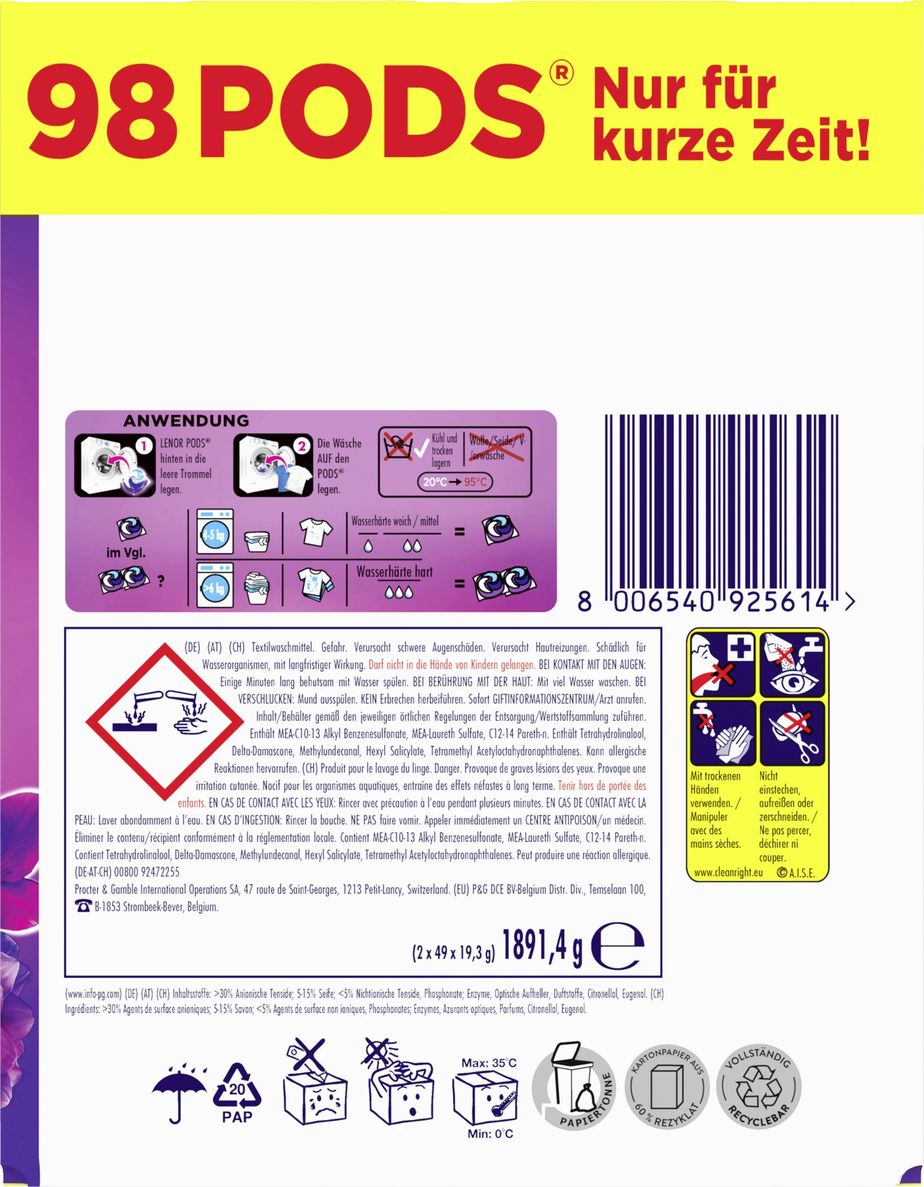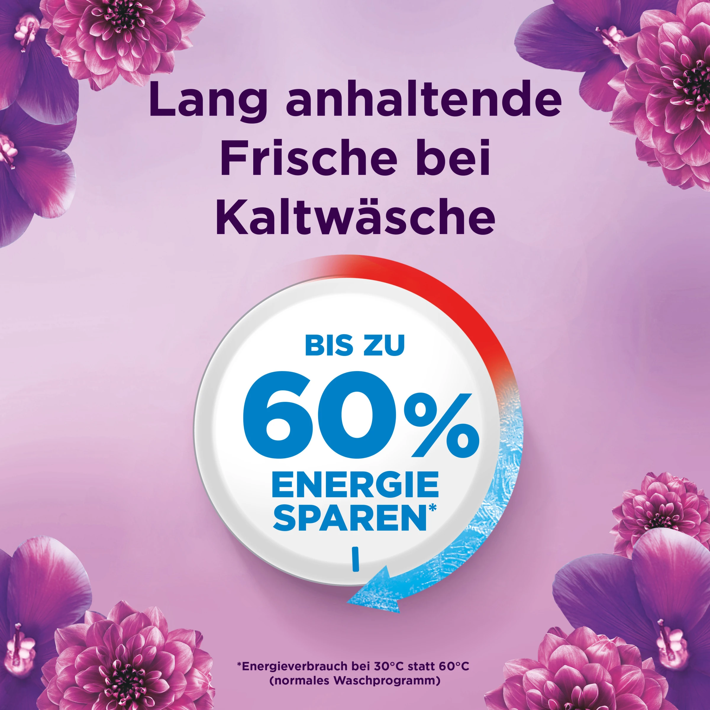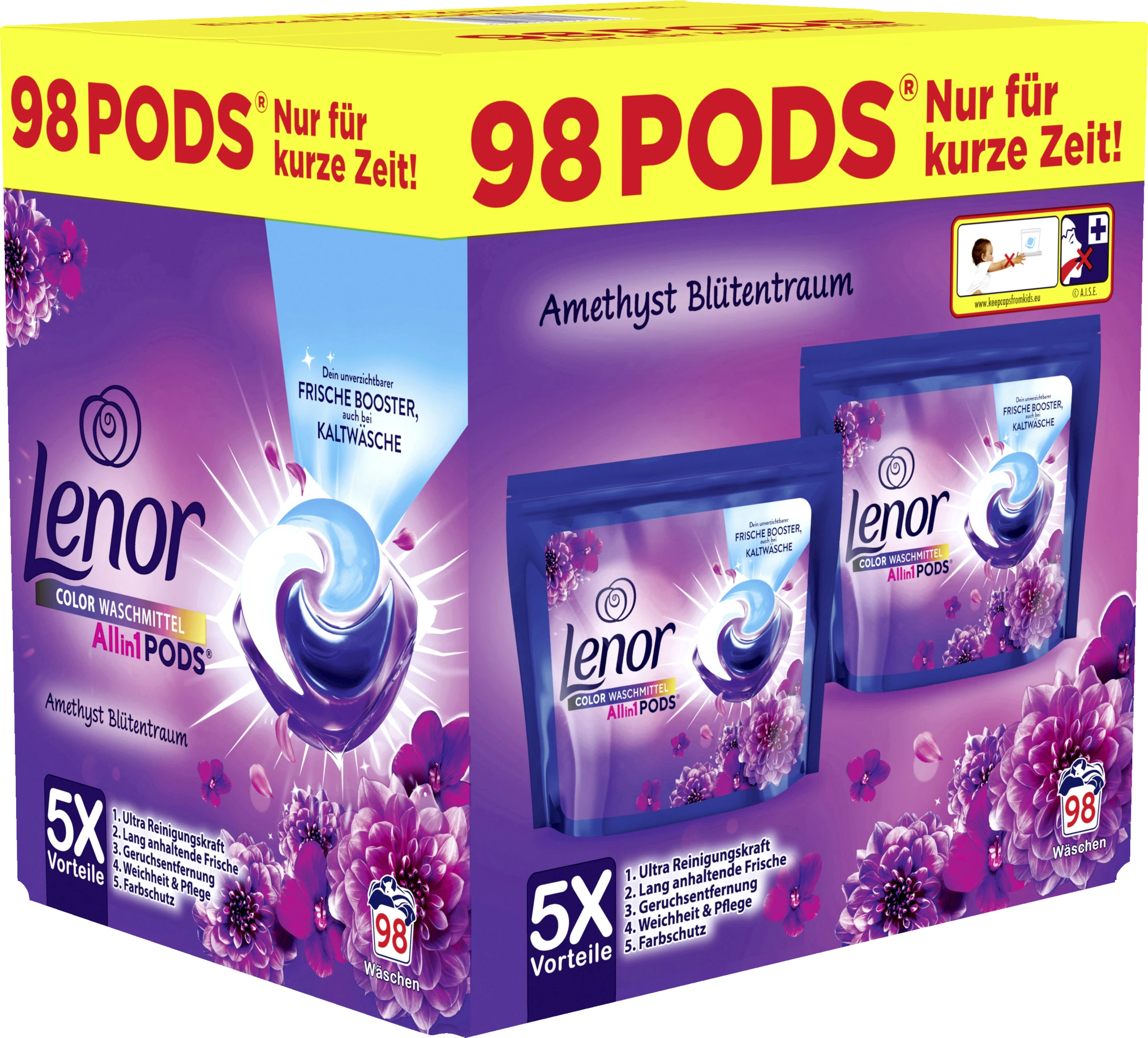 Testen Sie Lenor Waschmittel Allin1 PODS® Amethyst Blütentraum mit Ultra Reinigungskraft für hygienische Tiefenreinheit und lang anhaltende Frische. Die Ultra Reinigungskraft von Lenor dringt tief in die Fasern ein und entfernt Schmutz und Flecken, selbst bei niedrigen Waschtemperaturen ab 30 °C. Lenor PODS® mit zusätzlicher Kammer und Frische Booster in Kaltwäsche, damit Sie auch bei kälteren Waschtemperaturen lang anhaltende Frische genießen können.