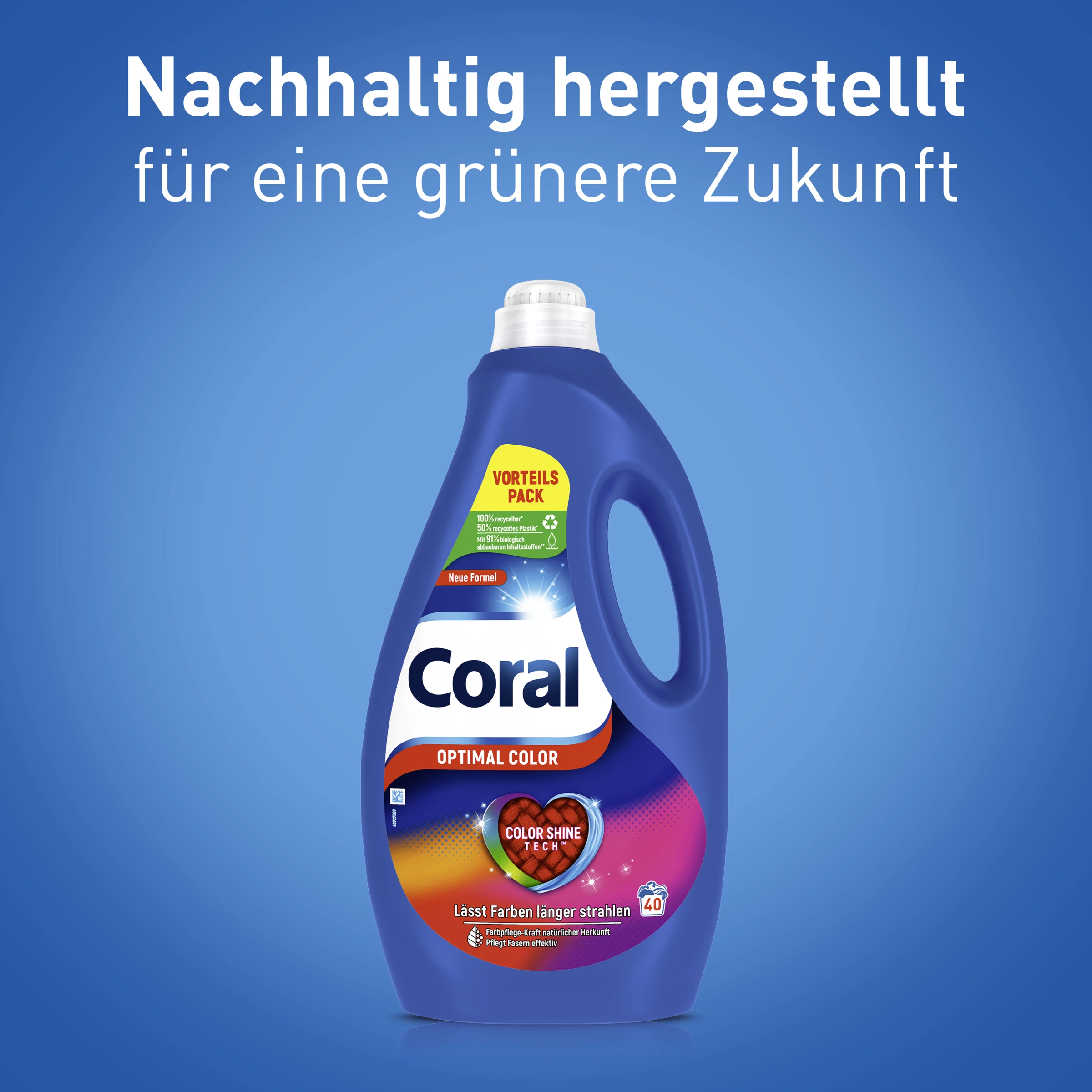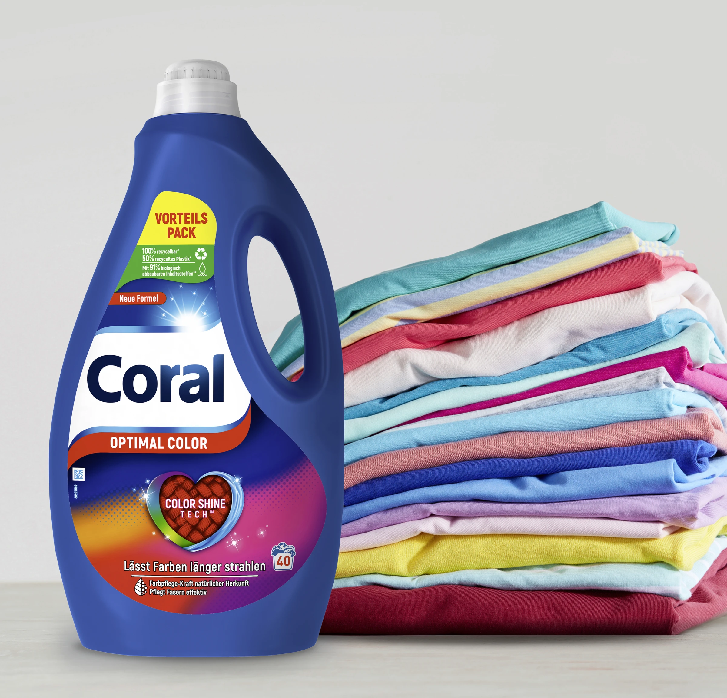 Das Coral Colorwaschmittel Optimal Color ist ein Flüssigwaschmittel und unser Experte für bunte Wäsche: tiefe Reinigung und leuchtende Farben. Die bunte Kleidung erstrahlt in neuem Glanz, Wäsche für Wäsche. Coral Optimal Color mit Farbpflege-Enzymen natürlicher Herkunft lässt Farben länger strahlen und pflegt bunte Fasern effektiv. Es enthält ausserdem 91% biologisch abbaubare Inhaltsstoffe. Die Flasche ist zudem 100% recycelbar und besteht zu 70% aus recyceltem Plastik (ohne Deckel und Etikett). Coral – Weil das echte Leben bunt ist. Bunte Kleidung braucht Pflege, die Rücksicht auf die Farben nimmt und gleichzeitig die Fasern schont. Unsere Pflege für bunte Kleidung mit der Color Shine Tech Formel erhält die Leuchtkraft der Farben und lässt bunte Kleidung weiterhin in kräftigen Farben erstrahlen. Coral Optimal Color mit Farbpflege-Kraft natürlicher Herkunft reinigt sanft und sorgt gleichzeitig für eine besondere Farbpflege der bunten Kleidung. So sieht sie länger wie neu aus. Verwöhne bunte Kleidung mit dem Flüssigwaschmittel Coral Optimal Color für intensive Farben. Die konzentrierte Formulierung von Coral Optimal Color gewährleistet eine hohe Ergiebigkeit bei gleichbleibender Reinigungsleistung und Pflegequalität der bunten Kleidung. Das Farbwaschmittel von Coral ist für bis zu 40 Waschgänge ergiebig und auch als Waschpulver sowie Caps-Waschmittel erhältlich. Coral Optimal Color Pflegeanleitung für farbenfrohe Kleidung: Bitte Pflegehinweise in den Textilien beachten. Dunkle Farben bitte separat waschen. Bei Vorbehandlung mit unverdünntem Waschmittel zuvor Farbechtheit prüfen. Für Wolle, Seide und Kaschmir bitte unser Feinwaschmittel Coral Wolle & Feines verwenden.