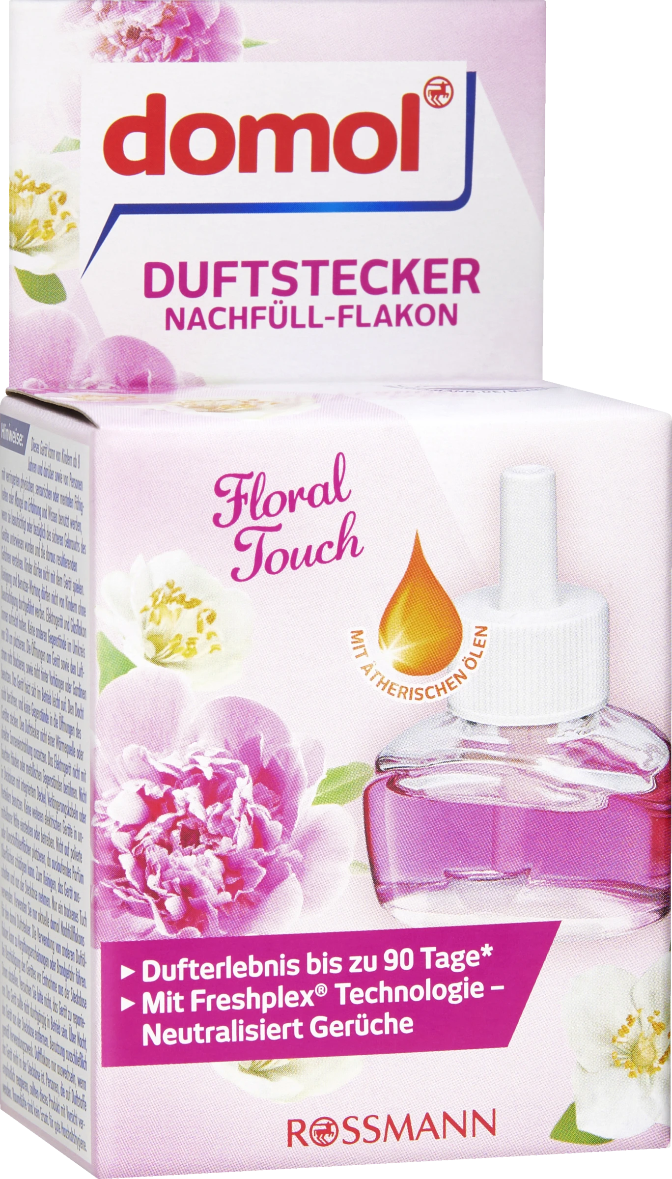 Den domol Duftstecker nur mit domol Duftstecker Nachfüll-Flakons verwenden. Dieses Gerät kann von Kindern ab 8 Jahren und darüber sowie von Personen mit verringerten physischen, sensorischen oder mentalen Fähigkeiten oder Mangel an Erfahrung und Wissen benutzt werden, wenn sie beaufsichtigt oder bezüglich des sicheren Gebrauchs des Gerätes unterwiesen wurden und die daraus resultierenden Gefahren verstehen. Kinder dürfen nicht mit dem Gerät spielen. Reinigung und Benutzer-Wartung dürfen nicht von Kindern ohne Beaufsichtigung durchgeführt werden. Elektrogerät und Glasflakon immer aufrechthalten. Keine anderen Gegenstände im Umkreis von 50 cm platzieren. Die Öffnungen am Gerät sowie den Luftstrom nicht blockieren, sowie nicht hinter Vorhängen oder Gardinen benutzen. Das Gerät heizt sich im Betrieb leicht auf. Den Docht nicht berühren, und keine Gegenstände in die Öffnungen des Gerätes stecken. Den Duftstecker nicht einer Wärmequelle oder direkter Sonneneinstrahlung aussetzen. Das Elektrogerät nicht mit feuchten Händen oder metallischen Gegenständen berühren. Nicht in Steckdosen mit integriertem Deckel, Verlängerungskabeln oder Verteilern benutzen. Keine weiteren elektrischen Geräte in unmittelbarer Nähe einstecken oder betreiben. Nicht auf polierte oder Kunststoffoberflächen platzieren, da auslaufendes Parfüm Oberflächen schädigen kann. Zum Reinigen, das Gerät ausschalten und aus der Steckdose nehmen. Nur ein trockenes Tuch verwenden. Verwenden Sie nur aktuelle domol Nachfüllflakons für den domol Duftstecker. Die Verwendung von anderen Duftölflakons kann zu Vergiftungserscheinungen oder Brandgefahr führen. Bei Beschädigung des Gerätes vor Entnahme aus der Steckdose Stromabstellen. Versuchen Sie bitte nicht, das Gerät zu reparieren. Das Gerät sollte nicht durchgängig in Betrieb sein. Über Nacht, das Gerät aus der Steckdose entfernen. Benutzung ausschließlich gemäß Verwendungszweck. Duftflakons nur auswechseln, wenn das Gerät nicht in der Steckdose ist. Personen, die auf Duftstoffe empfindlich reagieren, sollten dieses Produkt mit Vorsicht verwenden. Raumdüfte sind kein Ersatz für gute Haushaltshygiene.