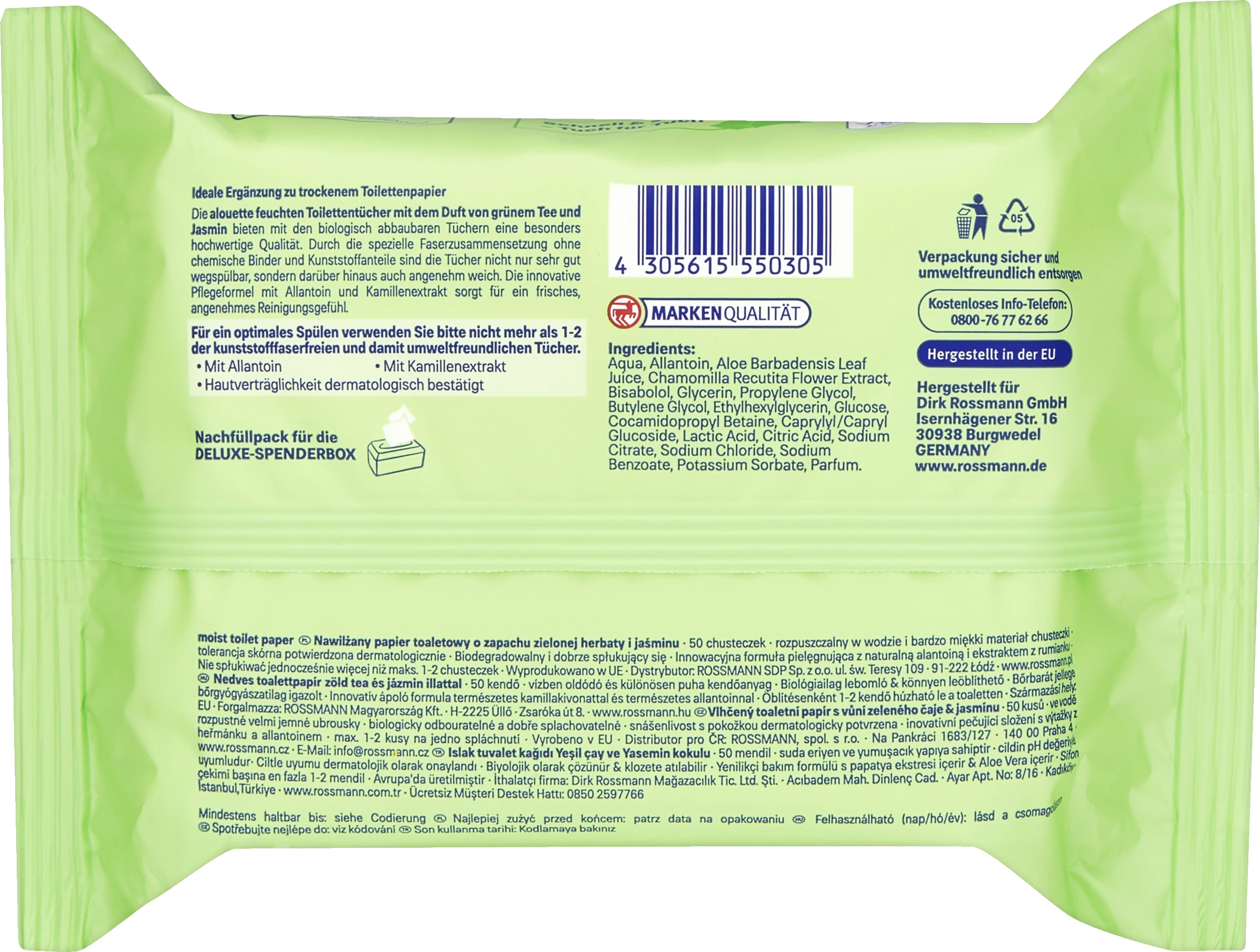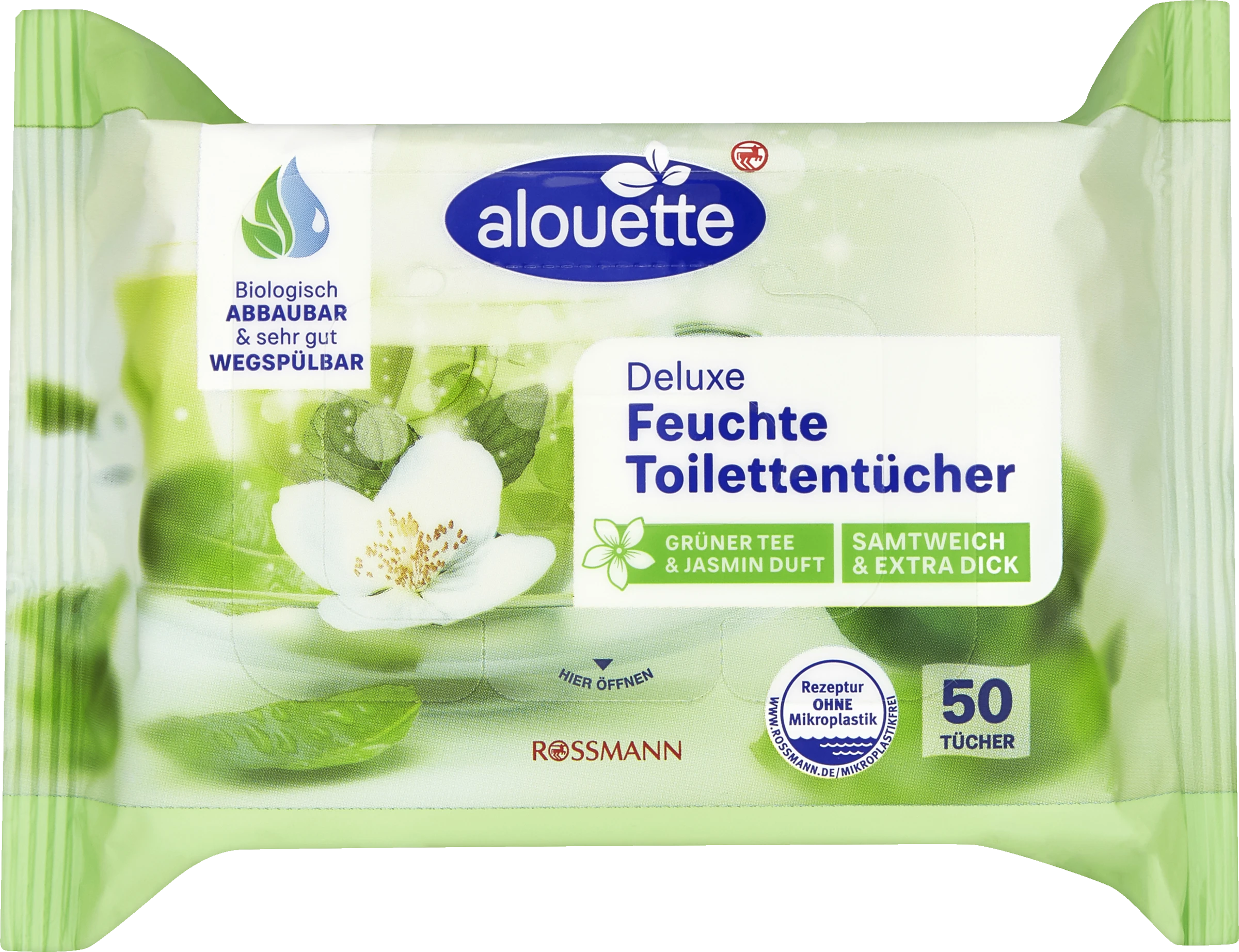 Ideale Ergänzung zu trockenem Toilettenpapier. Die alouette feuchten Toilettentücher Grüner Tee & Jasmin Duft bieten eine besonders hochwertige Qualität. Durch die spezielle Faserzusammensetzung des Vliesmaterials sind die Tücher nicht nur sehr gut wegspülbar, sondern darüber hinaus auch angenehm weich. Die innovative Pflegeformel mit natürlichem Allantoin und Kamillenextrakt sorgt für ein frisches, angenehmes Reinigungsgefühl.