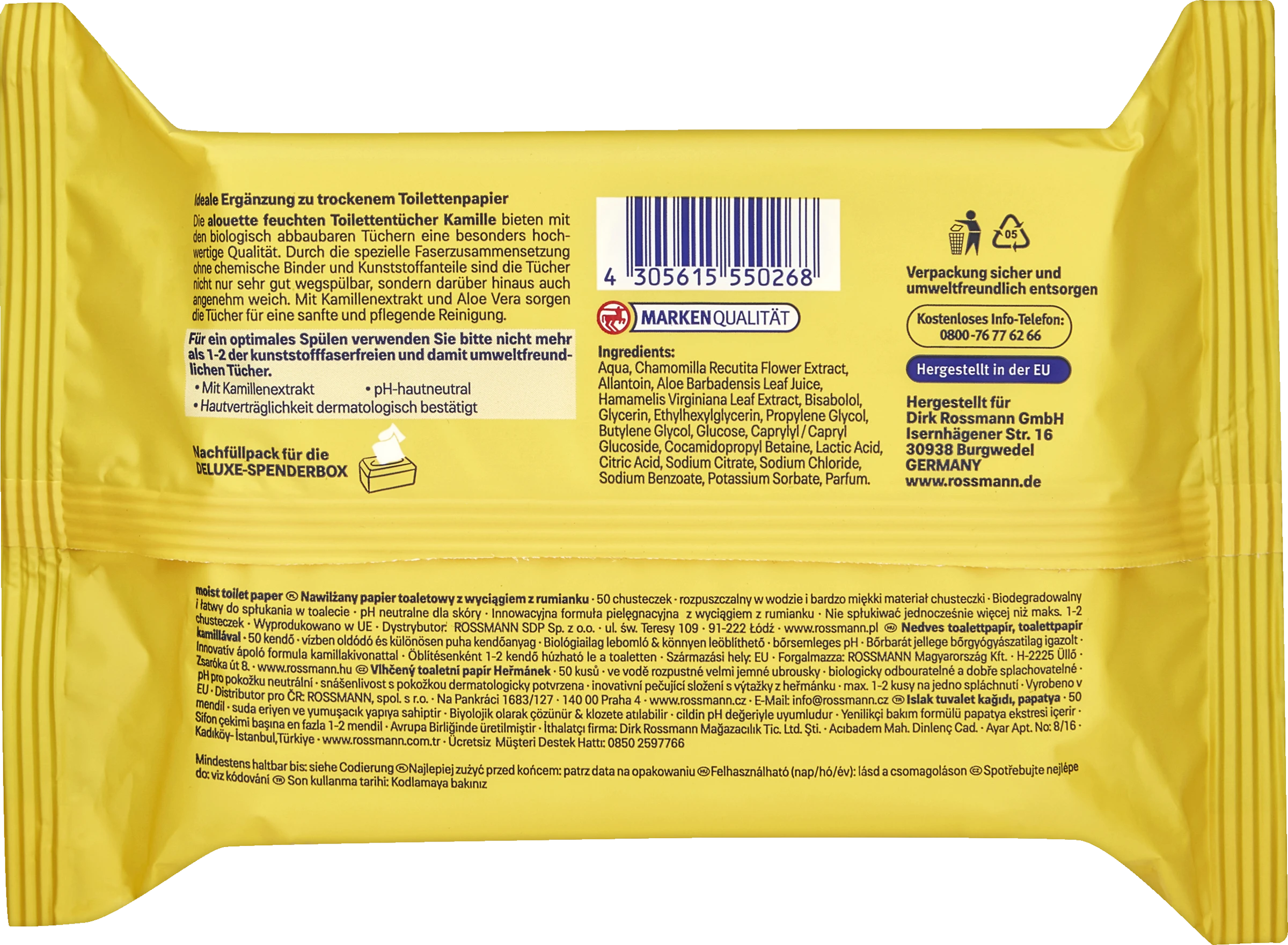 Aqua, Chamomilla Recutita Flower Extract, Allantoin, Aloe Barbadensis Leaf Juice, Hamamelis Virginiana Leaf Extract, Bisabolol, Glycerin, Ethylhexylglycerin, Propylene Glycol, Butylene Glycol, Glucose, Caprylyl/ Capryl Glucoside, Cocamidopropyl Betaine, Lactic Acid, Citric Acid, Sodium Citrate, Sodium Chloride, Sodium Benzoate, Potassium Sorbate, Parfum.