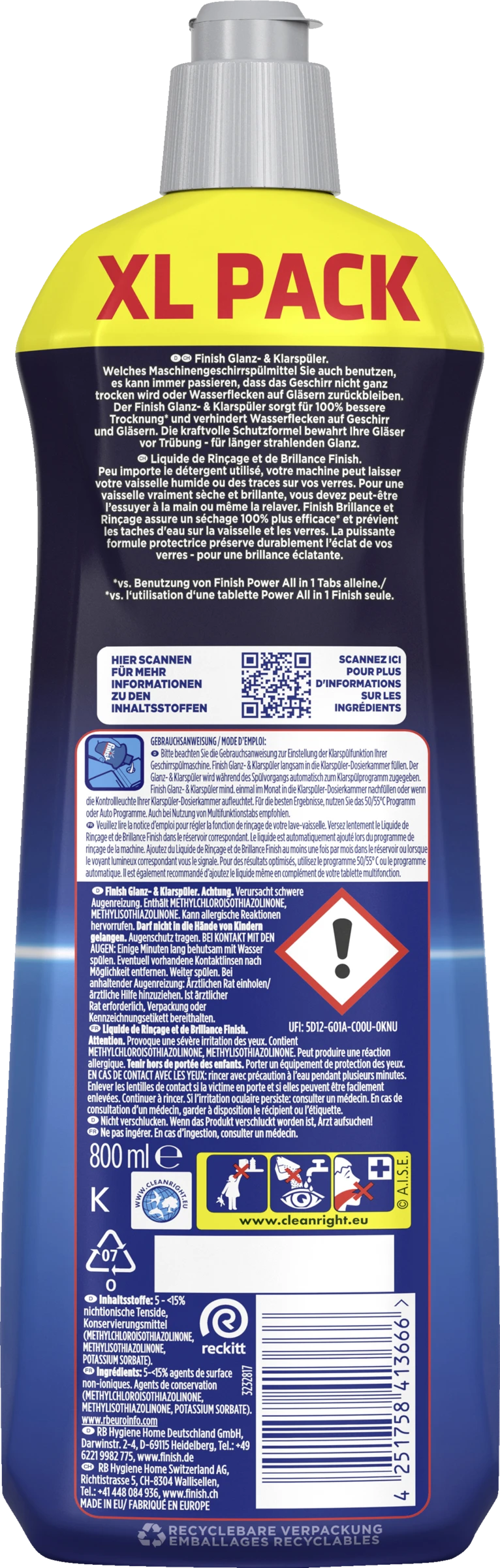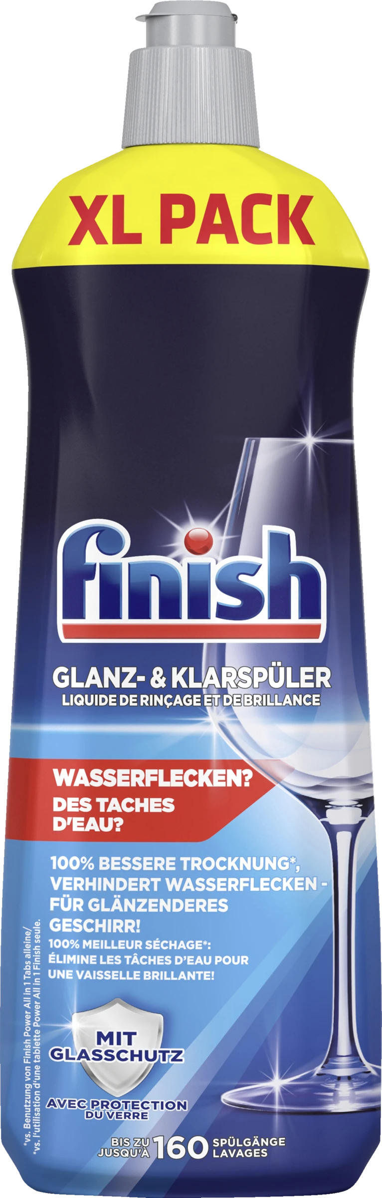Wasserflecken? Der Finish Glanz- & Klarspüler sorgt für 100% bessere Trocknung* und verhindert Wasserflecken auf Geschirr und Gläsern. Die kraftvolle Schutzformel bewahrt Ihre Gläser vor Trübung – für länger strahlenden Glanz.
