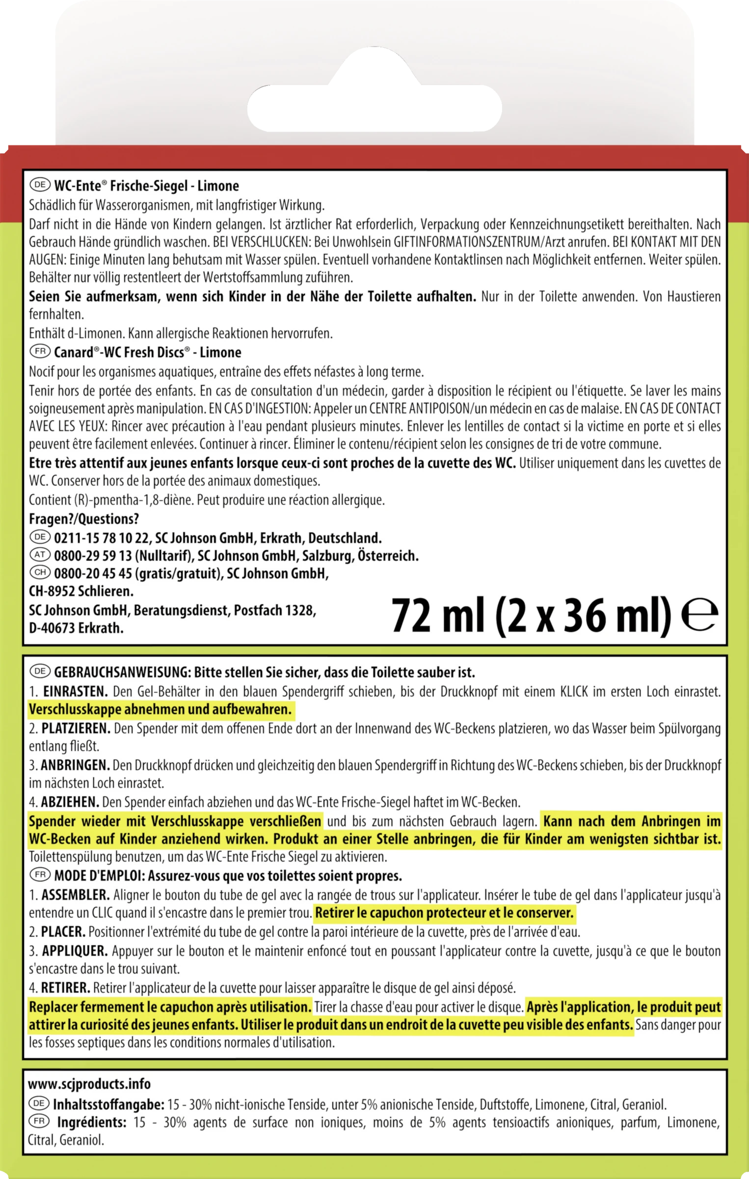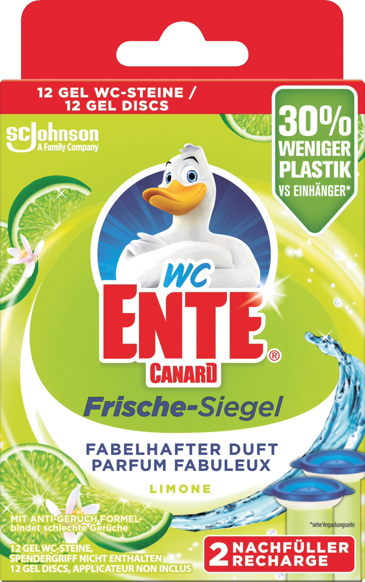 WC-Ente Frische-Siegel ist die innovative und dezente Alternative zum klassischen WC-Einhänger. Das Frische-Siegel ist das erste Frische-Gel für die Toilette, das ohne Toiletteneinhänger auskommt. Es ist für Toiletten mit Spülrand als auch für spülrandlose WCs geeignet. Das Gel wird mit Hilfe eines Spenders an der Innenwand des WC-Beckens wie ein Stempel platziert. Es setzt reinigende Substanzen und frischen Duft bei jeder Spülung frei. Der Nachfüller ist in verschiedenen Düften erhältlich.