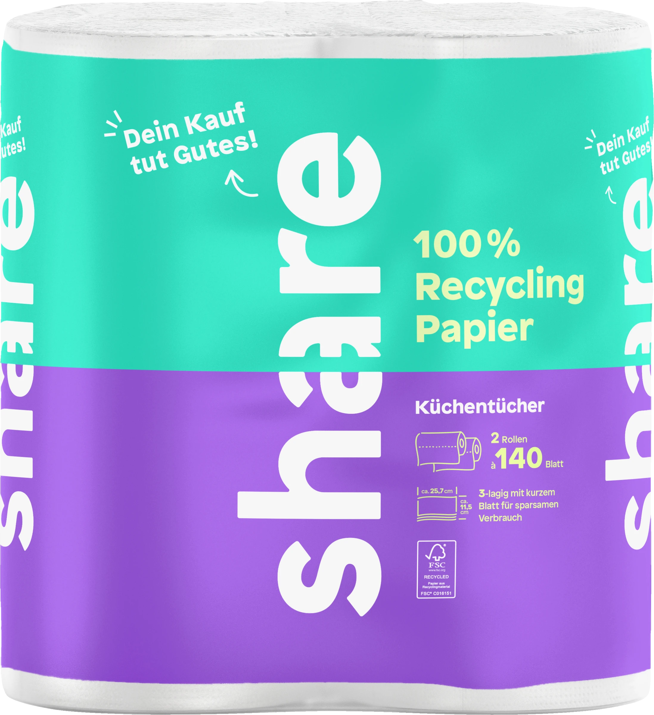 Die Küchenrolle von share ist nicht bloß ein nützlicher Alltagshelfer, sie erfüllt auch eine soziale Funktion. Mit deinem Kauf spendest Du ein Hygieneprodukt an einen Menschen in Not.