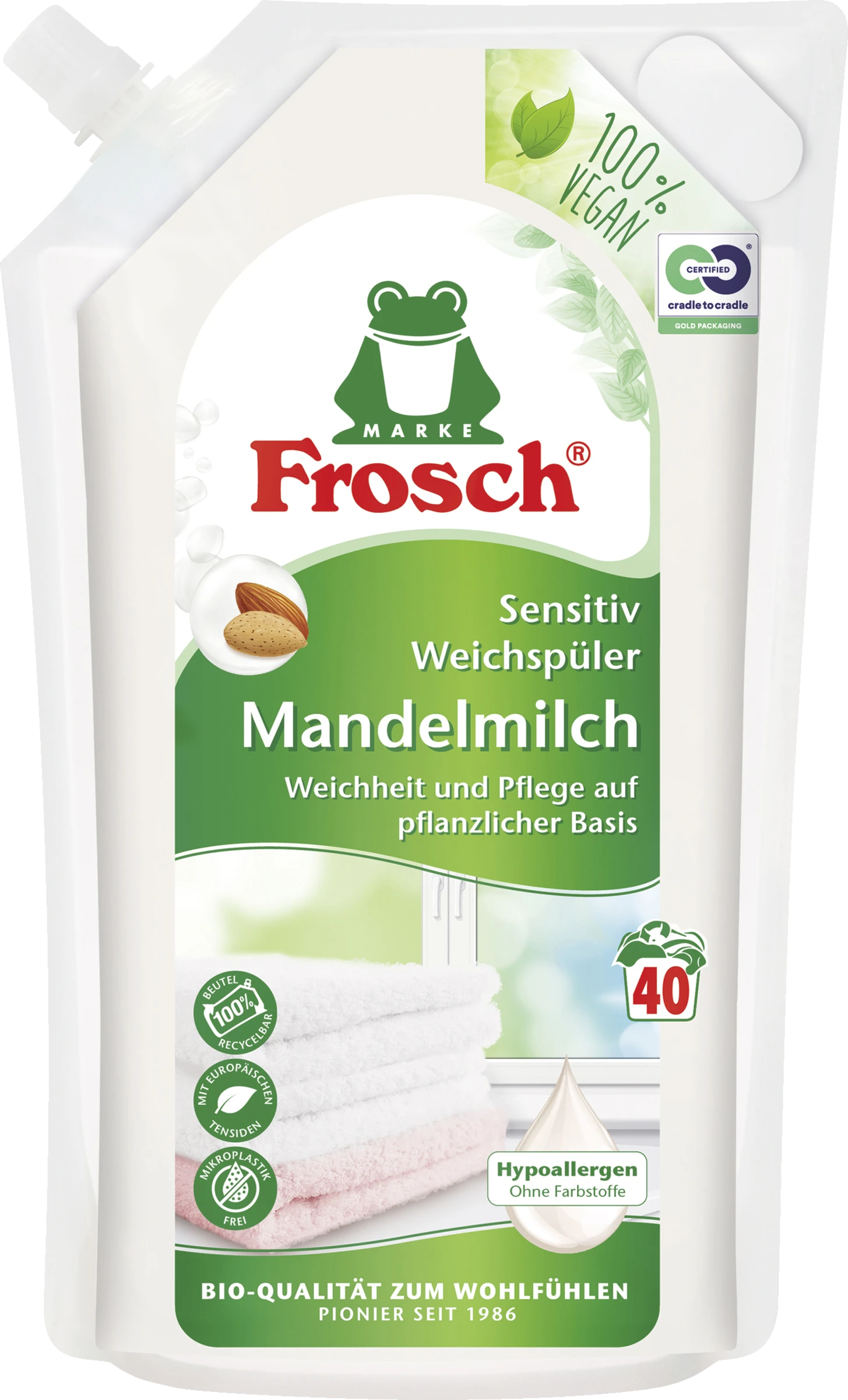 Der Frosch Mandelmilch Sensitiv-Weichspüler sorgt auf pflanzlicher Basis für duftend-weiche und gepflegte Wäsche. Die vegane Rezeptur mit Mandel-Extrakt pflegt und glättet die Fasern und verleiht der Wäsche einen hohen Tragekomfort und einen natürlich frischen Duft. Der hypoallergene Weichspüler verzichtet auf Farbstoffe und setzt nur ausgewählt milde Duftstoffe ein, so dass sich der Weichspüler für Personen mit empfindlicher Haut und Allergiker bestens eignet. Seine sehr gute Hautverträglichkeit wurde dermatologisch bestätigt. VEGAN: Viele Weichspüler enthalten tierische Stoffe, um die Wäsche weich zu machen. Die Frosch Weichspüler verwenden stattdessen Stoffe auf pflanzlicher Basis.