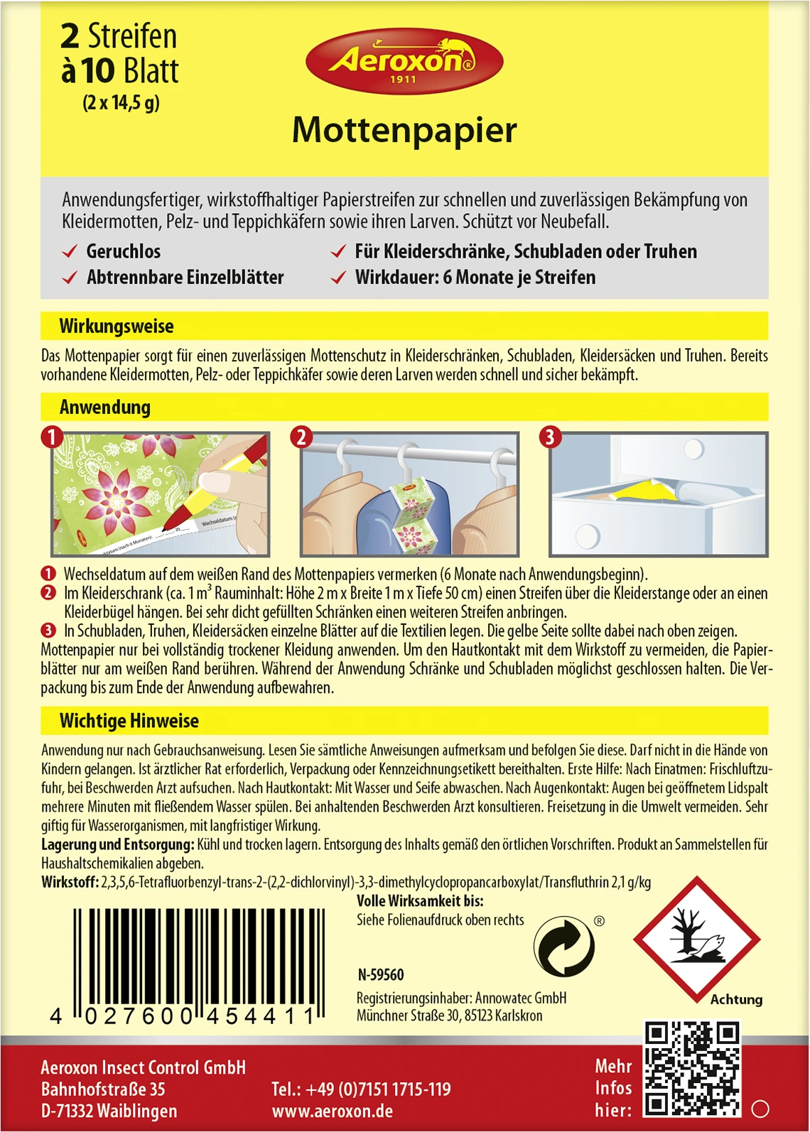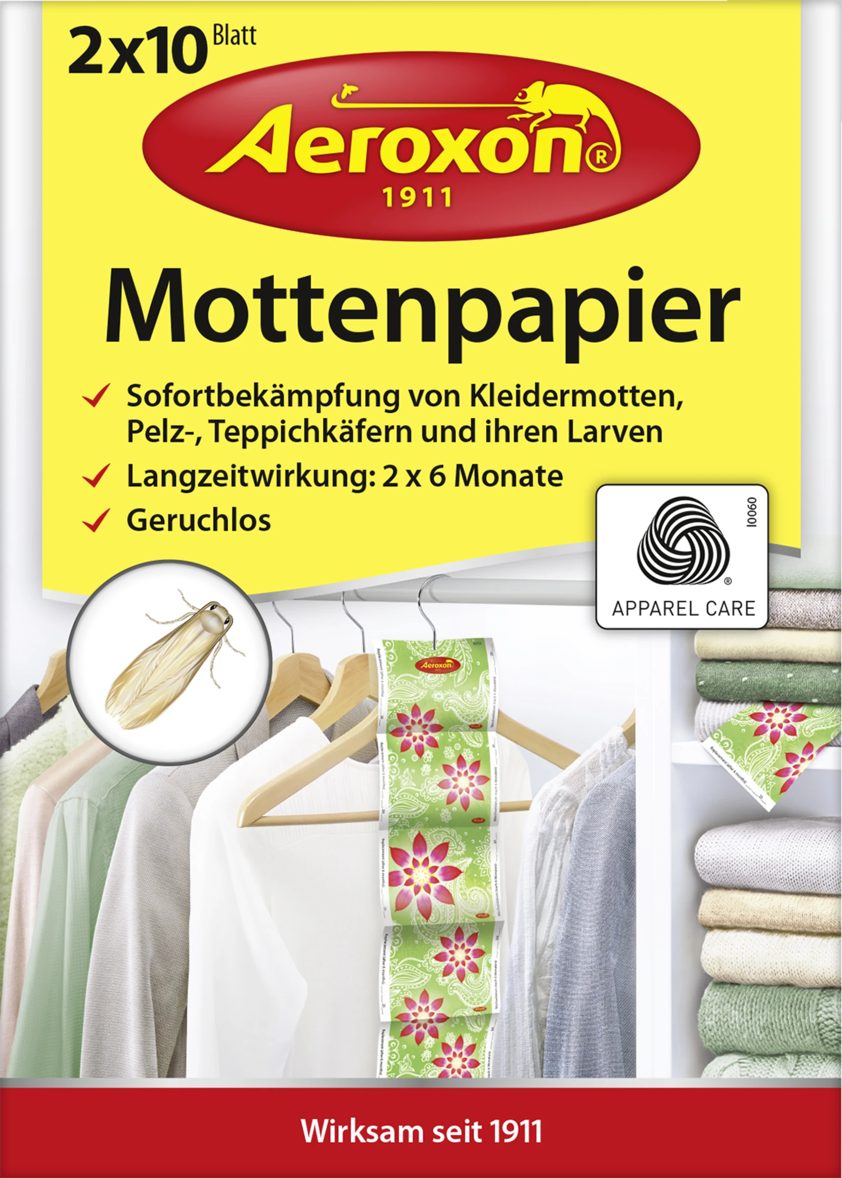 Das Aeroxon Mottenpapier sorgt für einen zuverlässigen Mottenschutz in Kleiderschränken, Schubladen, Kommoden und an Teppichen. Bereits vorhandene Kleidermotten, Pelz- oder Teppichkäfer sowie ihre Larven werden schnell und sicher bekämpft. Die Wirkdauer je Streifen beträgt 6 Monate.