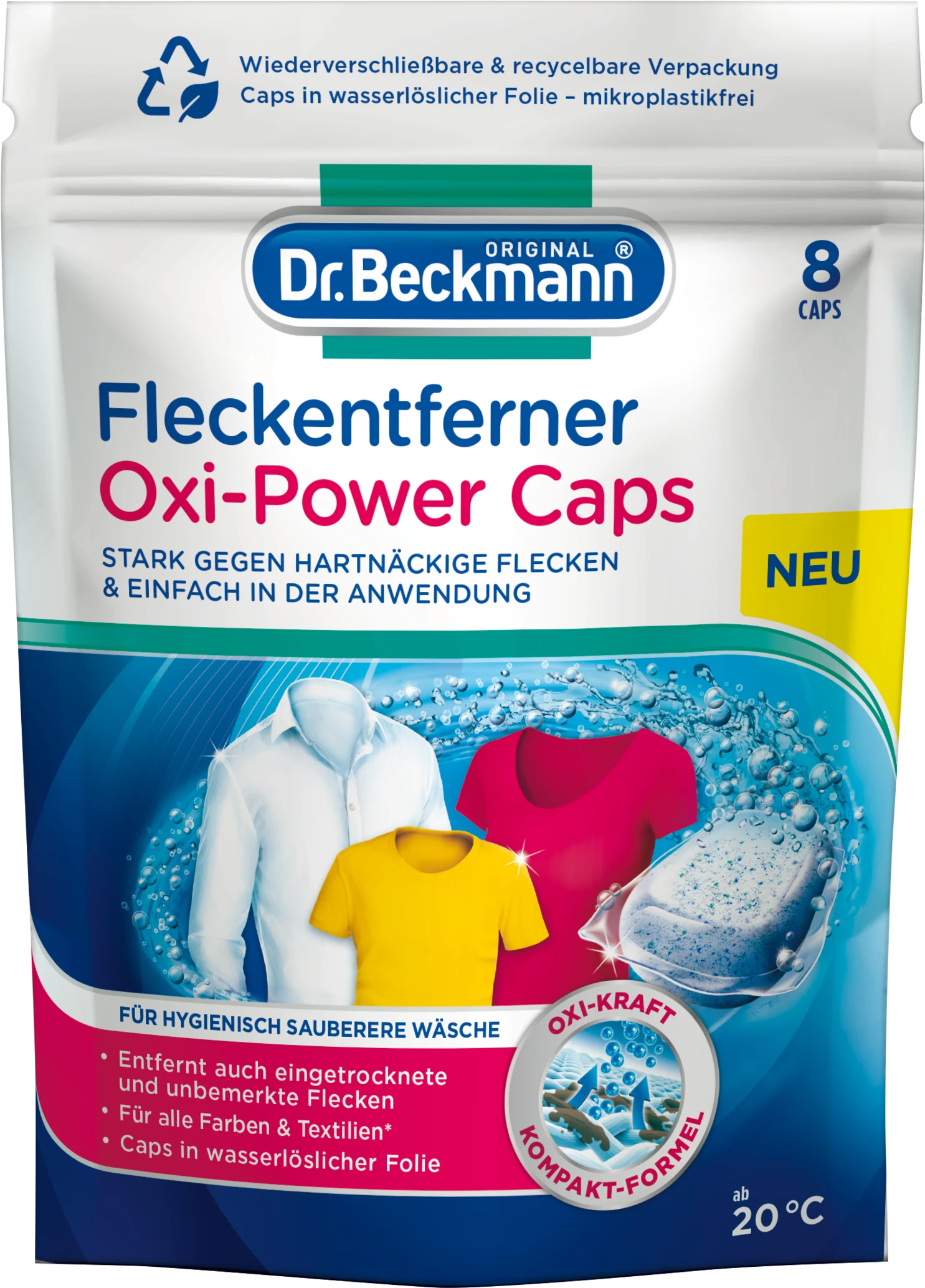Dr. Beckmann OXI-POWER CAPS entfernen mehr als 100 hartnäckige Flecken so bequem wie nie. Einfache Anwendung. Für alle weißen und farbechten Textilien. Kombinierbar mit allen Waschmitteln und -Formaten. Wasserlöslich Folie.