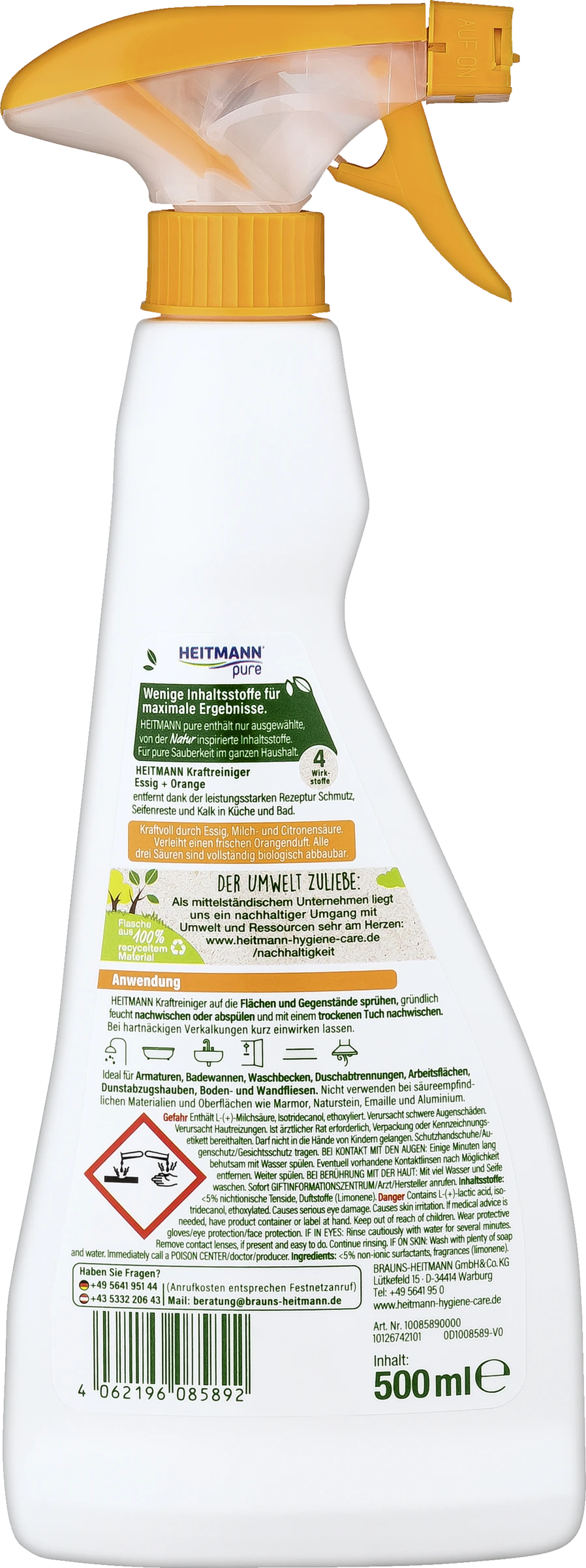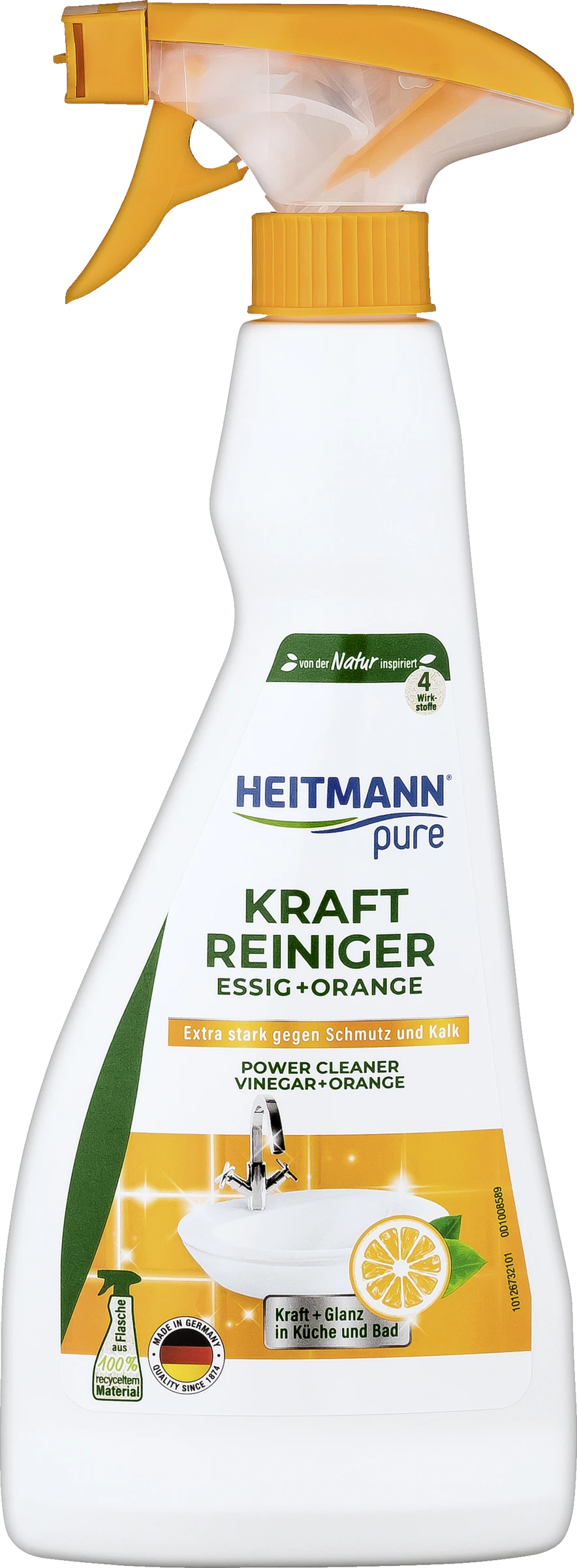 Entfernen Sie Schmutz, Seifenreste und Kalk ganz einfach mit dem praktischen Kraftreiniger-Spray von HEITMANN pure. Die kraftvolle Rezeptur mit Essig, Milch- und Citronensäure bringt Armaturen, Badewannen, Waschbecken, Duschabtrennungen, Arbeitsflächen, Dunstabzugshauben, Boden- und Wandfliesen wieder zum Strahlen. Bei regelmäßiger Anwendung beugt der Kraftreiniger neuen Kalkablagerungen vor. Der Kraftreiniger Essig + Orange verleiht einen angenehm frischen Orangenduft.