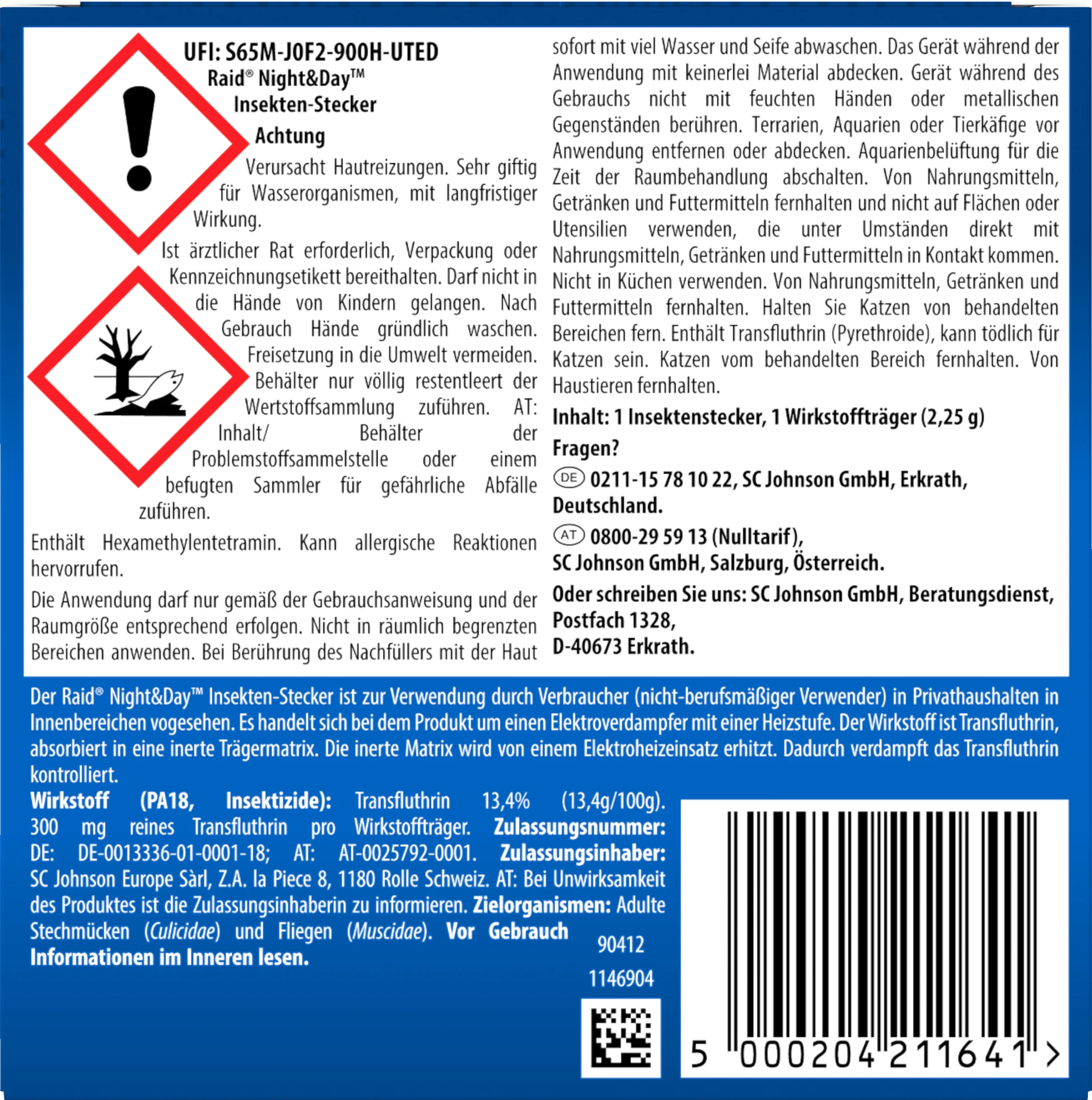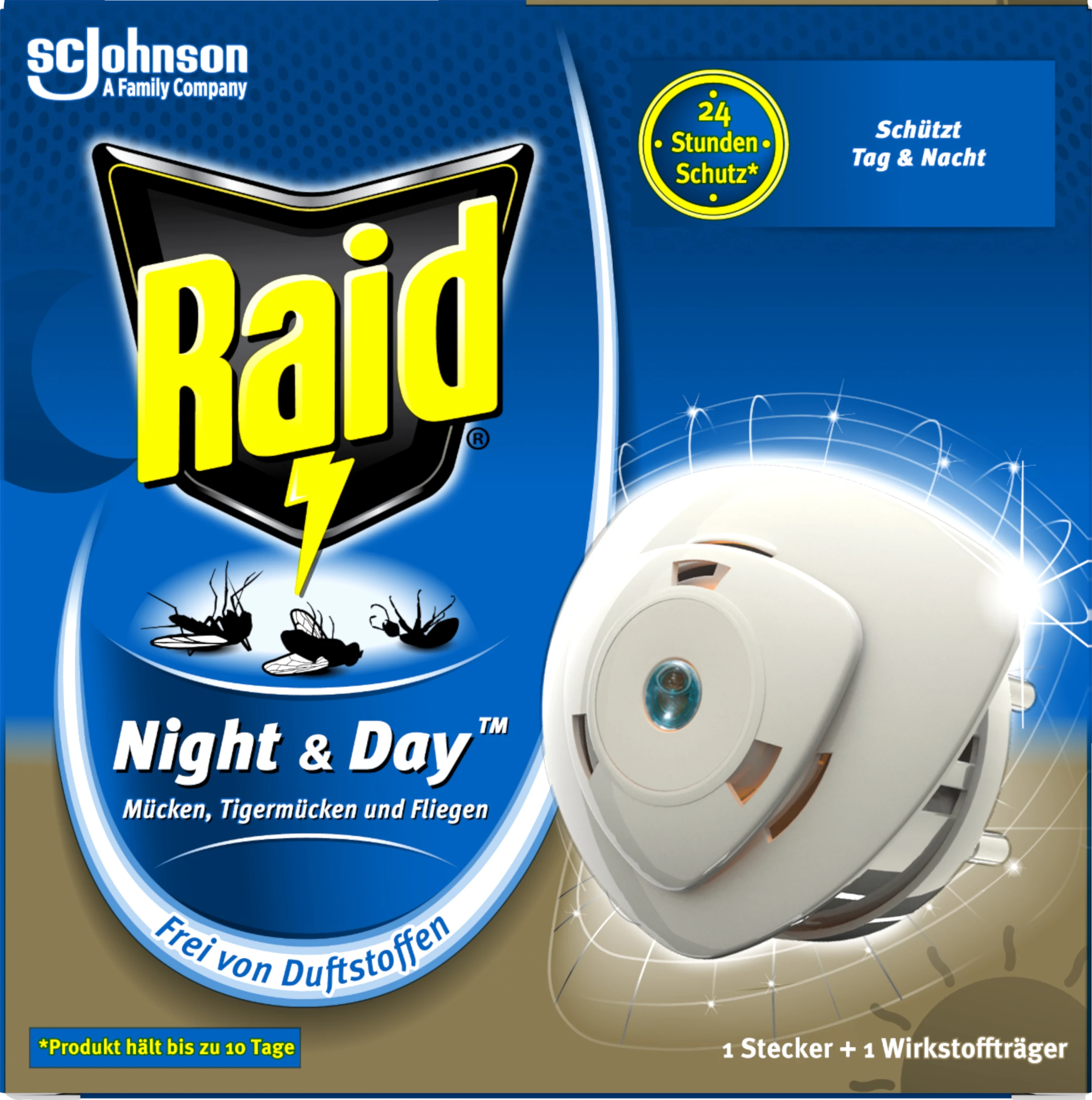 Der Raid Night & Day Trio Insekten-Stecker bietet einen kontinuierlichen Schutz vor Mücken, Fliegen und Ameisen. Der kompakte elektrische Mückenschutz nutzt einen Wirkstoffträger aus komprimiertem Sand. Dieser ist frei von Duft- und Zusatzstoffen und enthält nur die gegen Mücken, Fliegen und Ameisen wirksame Substanz. Nach Einstecken des Gerätes wird der Wirkstoff zur Mückenabwehr kontinuierlich an die Luft abgegeben und bietet verlässlichen Schutz gegen Mückenstiche. Die Intensitätsanzeige zeigt an, ob das Gerät aktiv ist und welche Stufe gewählt wurde. Inbetriebnahme: Den Stecker in eine Steckdose stecken und damit den Schutz gegen Mücken, Fliegen und Ameisen aktivieren. Die Wirkung gegen Mücken und Fliegen setzt innerhalb von 10 min nach Aktivierung ein, die gegen Ameisen innerhalb von 4 Stunden nach Aktivierung. Ein Wirkstoffträger reicht für bis zu 30 Anwendungen bei einer Anwendungsdauer von je 8 Stunden (=240 Stunden) bei Räumen bis zu 20m³.
