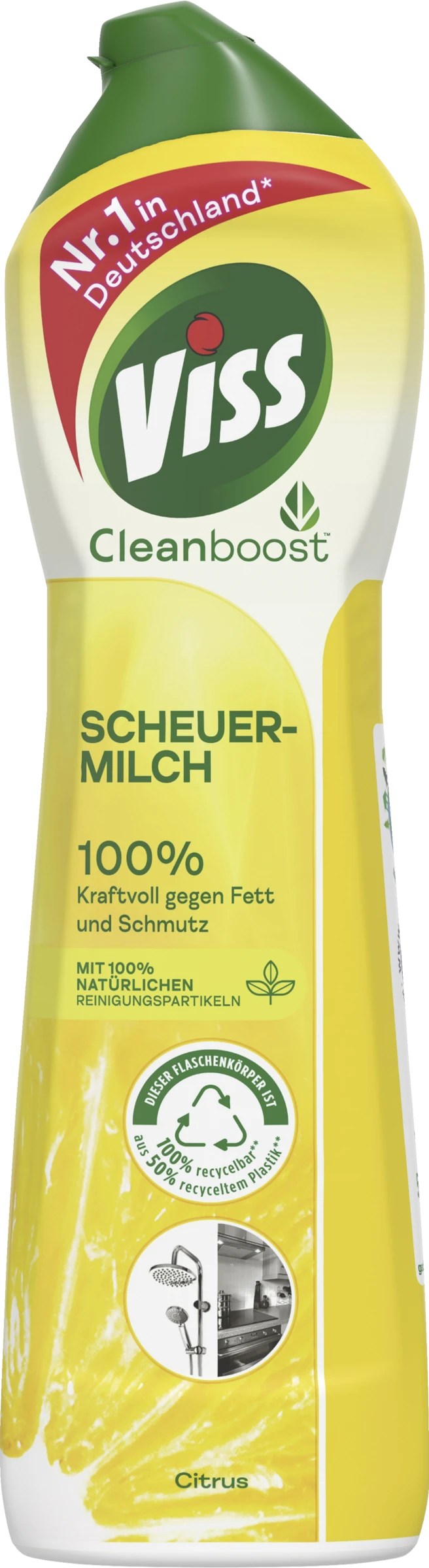Die Viss Scheuermilch Citrus bietet eine unglaubliche Reinigungskraft für jeden Zweck. Millionen von natürlichen Reinigungspartikeln in jedem Tropfen reinigen Küchen, Bäder und mehr. Das vielseitige Produkt entfernt Schmutz zu 100% und sorgt für Glanz und makellose Sauberkeit – jeden Tag. Die Scheuermilch pflegt die Oberflächen und entfernt auch den hartnäckigsten Schmutz zu 100% – mit Hilfe von Reinigungspartikeln, die Verunreinigungen einfach abheben. Die Viss Scheuermilch bietet strahlenden Glanz für Keramik, Edelstahl, Emaille, Kunststoff und Glaskeramik. Der unverkennbare Zitrusduft der Viss Scheuermilch sorgt für ein langanhaltendes Frische-Erlebnis im ganzen Haus. Die Scheuermilch von Viss ist der Putz-Profi im ganzen Haushalt und ist als Küchenreiniger und Badreiniger sehr gut geeignet. Das kraftvolle Scheuermittel entfernt Schmutz, Kalk- und Fettablagerungen schnell und sichtbar. Es durchdringt und entfernt hartnäckigen Schmutz wie z.B. verkrustetes Fett, angebrannte Essensreste und Kalkrückstände. Die Anwendung des Produkts ist einfach, denn dank der einzigartigen Formel lässt sich die Viss Scheuermilch leicht und mit weniger Wasser abspülen. Zum Auftragen einen feuchten Schwamm oder ein feuchtes Tuch benutzen, sauber wischen und einfach abspülen. Die Viss Scheuermilch gibt es in einer ganzen Palette frischer Duftnoten, passend für jedes Zuhause. Man kann ganz einfach die Viss Scheuermilch Frühlingsblüten, die Viss Scheuermilch Original mit einer frischen Meeresbrise oder die Viss Scheuermilch Aktivbleiche ausprobieren. Alle Putzmittel sind einfach anzuwenden und sorgen für Sauberkeit und Glanz im ganzen Haus.