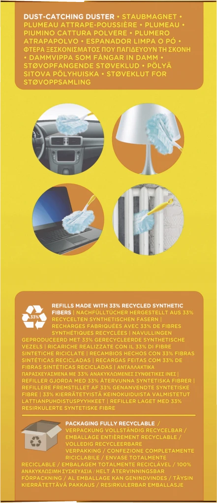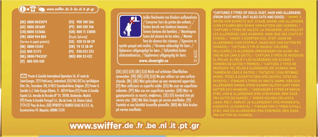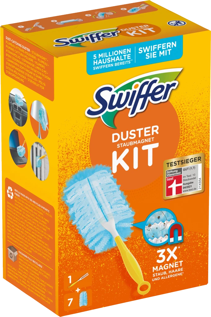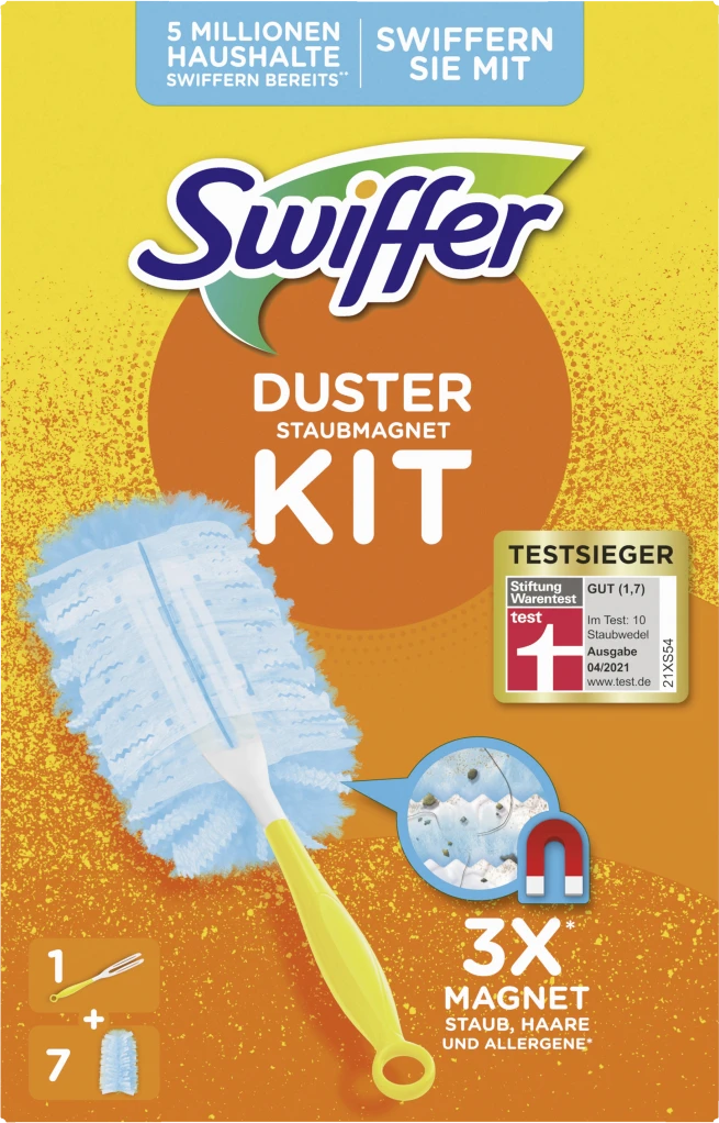 5 Millionen Haushalte swiffern bereits*. Swiffern Sie mit. Verabschieden Sie sich von Staub, Schmutz und Haaren! Der Swiffer Staubmagnet nimmt Staub, Haare und Allergene von Staubmilben, Katzen und Hunden auf und schließt diese ein. Dank tausender flexibler, flauschiger Fasern passt er seine Form an und erreicht alle Ritzen und Ecken – so können Staub und Haare von praktisch jeder Oberfläche entfernt werden. Tipp: Besonders praktisch für die Aufnahme von Tierhaaren oder wenn Sie an Stauballergien leiden. Der Swiffer Staubmagnet ist so schnell und einfach zu verwenden, da macht Staubwischen sogar Spaß. 99% der ‘brands you love’-Community empfehlen Swiffer Staubmagnet und Swiffer Bodenwischer weiter (418 Befragungsteilnehmer 09/2018).