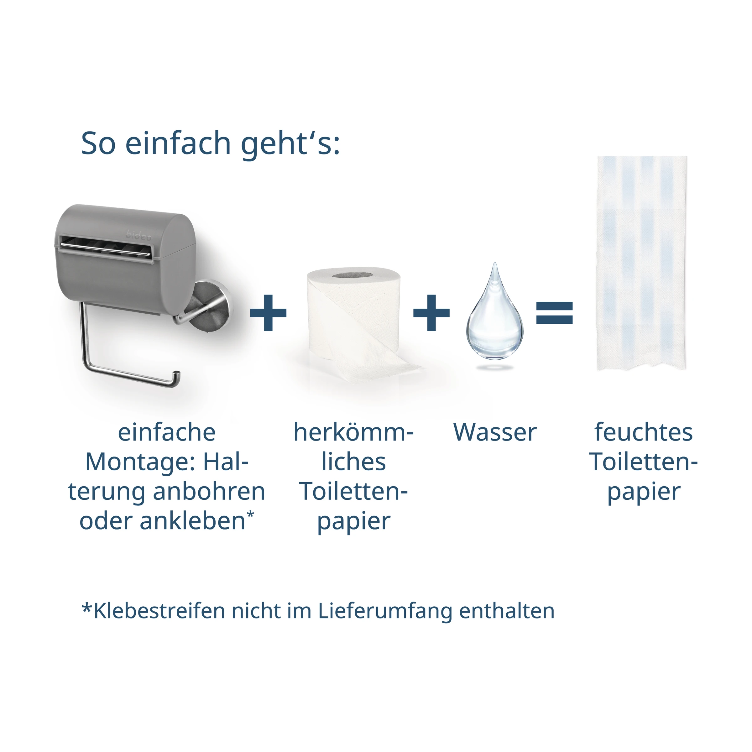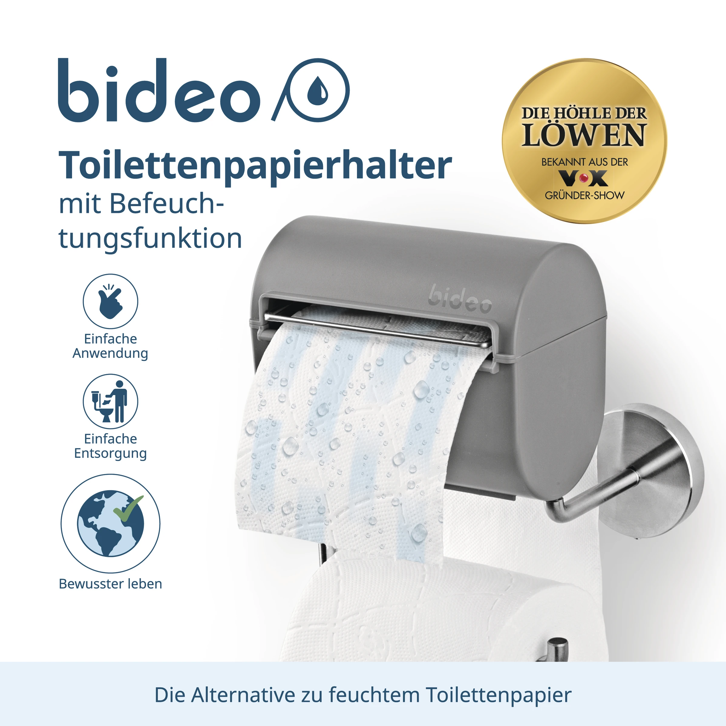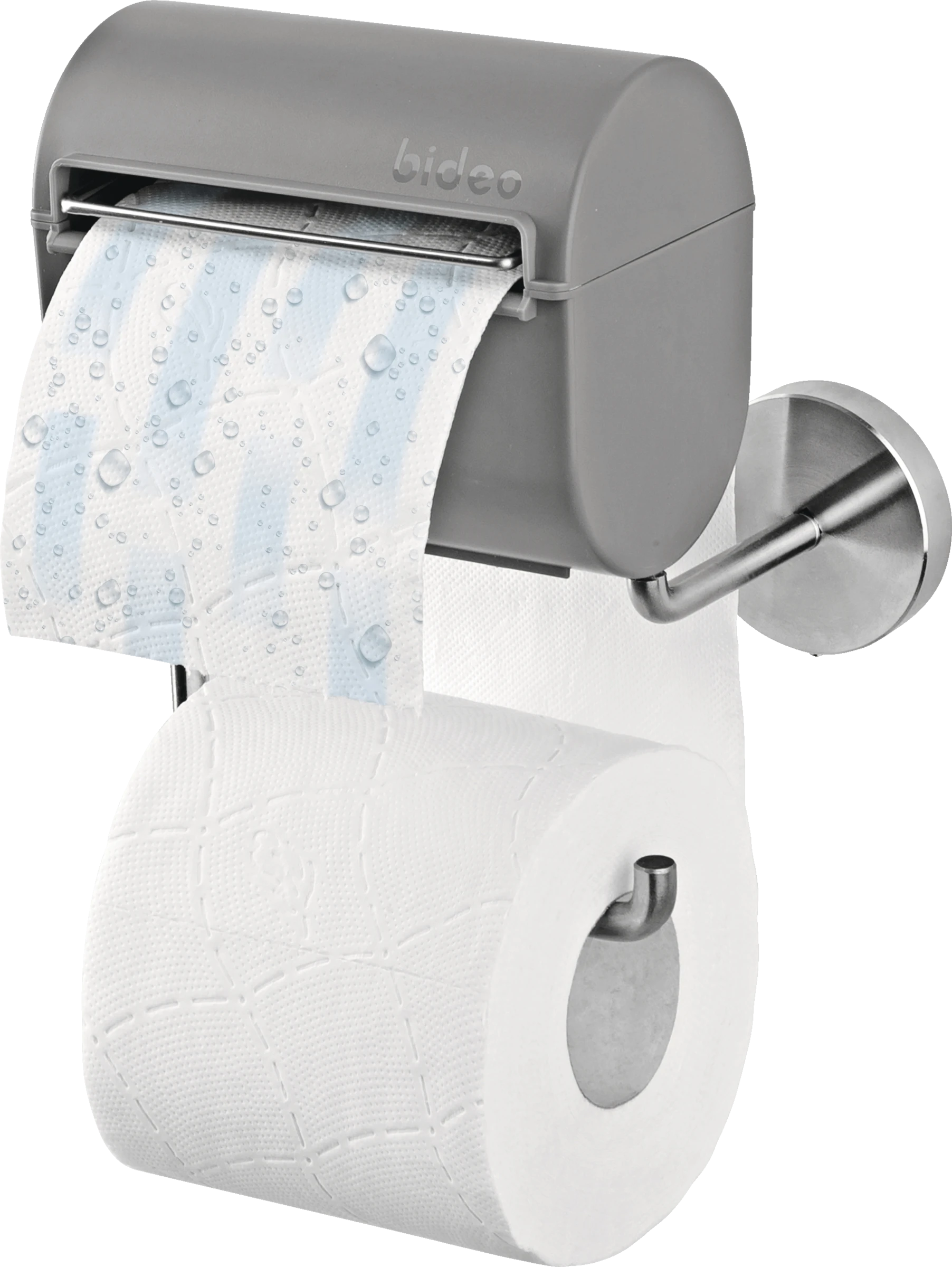 Ein frisches, sauberes Gefühl nach dem Toilettengang wünscht sich jeder – daher greifen viele Menschen gerne zu handelsüblichem feuchtem Toilettenpapier. Es hat sich jedoch gezeigt, dass die Reinigung nur mit Wasser für eine Erhaltung des natürlichen Haut-pH-Wertes optimal ist. Dafür steht bideo, ein genialer Toilettenpapierhalter mit Befeuchtungsfunktion. Mit bideo stellen Sie feuchtes Toilettenpapier ganz leicht selbst her! Durch die integrierte Walze im Toilettenpapierhalter wird das Papier beim Ziehen nach unten automatisch mit dem eingefüllten Wasser befeuchtet. Eine rundum saubere Lösung! Je nach Ziehrichtung für die Feucht- oder Trockenanwendung geeignet.