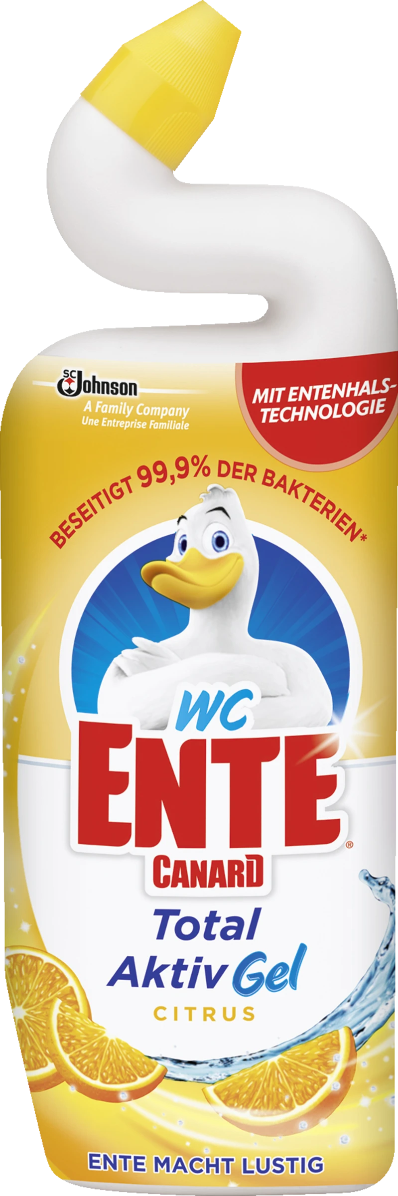 WC-Ente Total Akiv Gel. Dank seines Entenhals erreicht das Gel versteckte Bakterien und Schmutz tief unter dem Rand. Seine Formel beseitigt 99,9% der Bakterien und hinterlässt einen angenehm frischen Duft. Kalk und andere Ablagerungen werden entfernt.