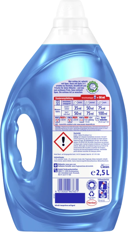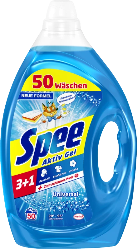 Das Spee Aktiv Gel Universal 3+1 sorgt für Reinheit, Strahlkraft und Frische für die Wäsche – und das zum schlauen Preis. Ganz einfach! Spee. Die schlaue Art, zu waschen. Dank der Parfümtechnologie verleiht das Vollwaschmittel von Spee der Wäsche einen langanhaltenden frischen Duft und bietet schon bei niedrigen Temperaturen effektive Fleckentfernung.