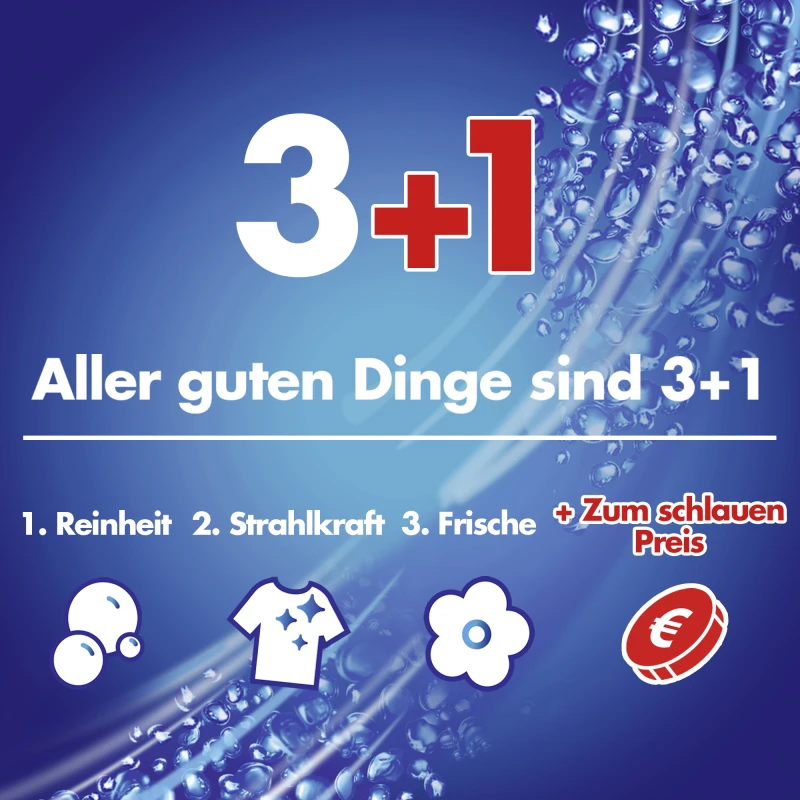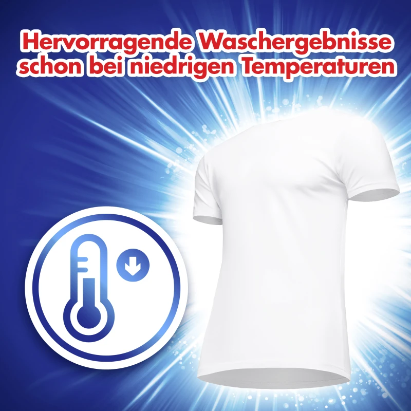 Das vielseitige Waschmittel ist für Waschtemperaturen von 20 °C bis 95 °C geeignet. Durch die leistungsstarke Formel lassen sich schon bei 20 Grad gute Waschergebnisse erzielen. Die Dosieranweisung ist abhängig von der Größe der Waschmaschine, der Wasserhärte und dem Verschmutzungsgrad der Wäsche.