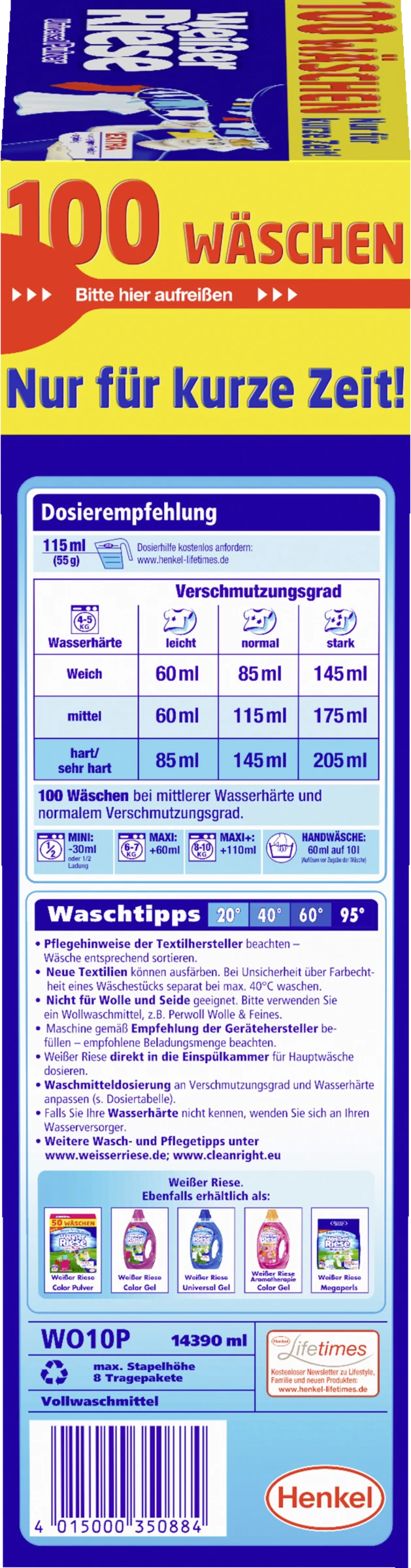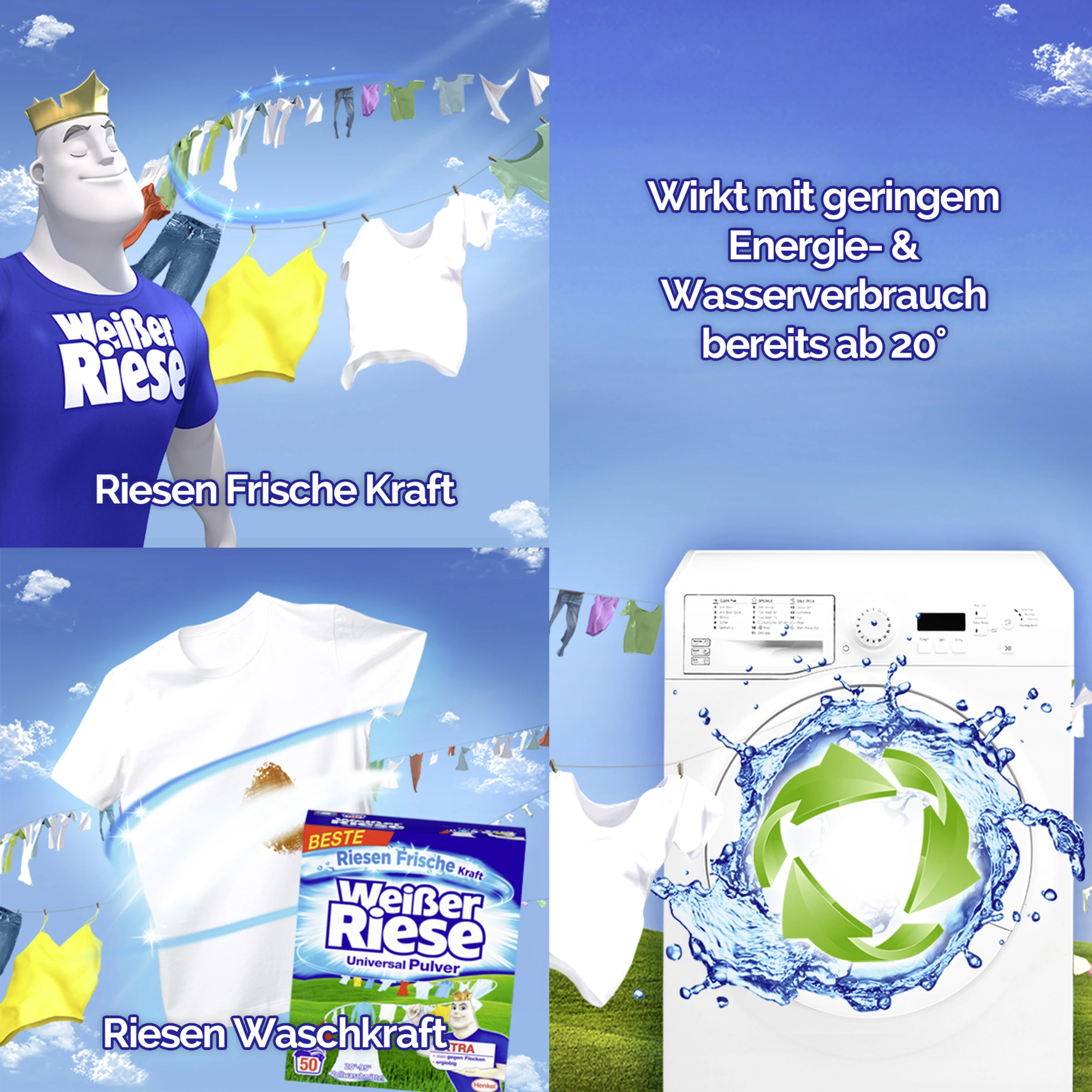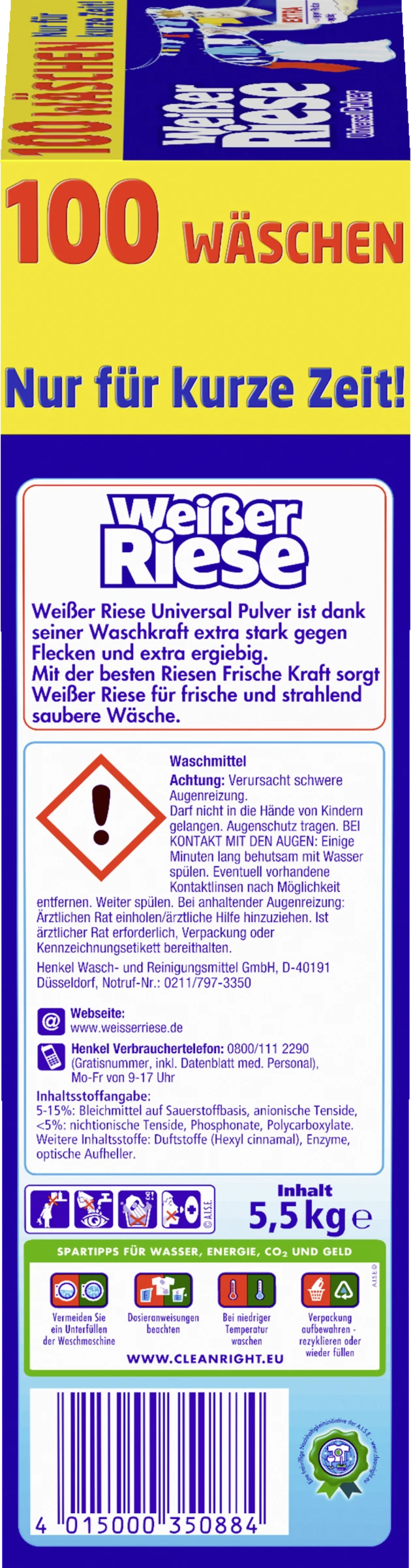 Weißer Riese Universal Pulver ist das ideale Waschmittel für Familien mit Kindern. Dank seiner Riesen Waschkraft ist es extra stark gegen Flecken sowie extra ergiebig und sorgt für hygienisch reine und strahlend saubere Wäsche. Das kraftvolle Pulver ist von 20°C bis 95°C verwendbar und sorgt für strahlend saubere weiße und helle Wäsche. Schon bei 20 Grad lassen sich gute Waschergebnisse erzielen. Die verbesserte Parfümtechnologie sorgt zudem für einen langanhaltenden Duft, wie frisch von der Leine. Riesen Waschkraft für riesen Wäscheberge.