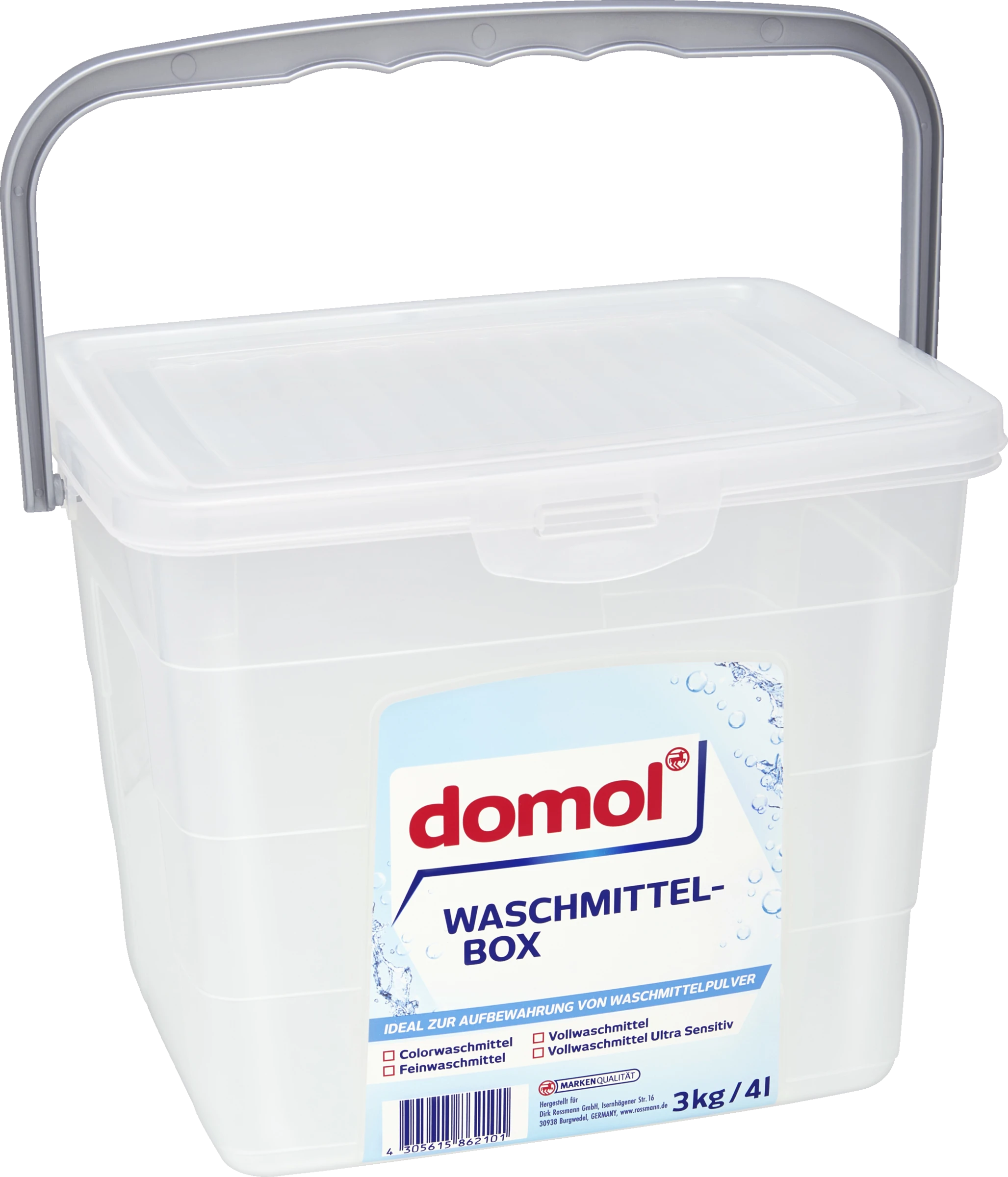 Die praktische domol Waschmittelbox ist ideal als Aufbewahrungsort für Waschmittelpulver aus Nachfüllpackungen geeignet. So bleibt Ihr Waschmittel gut verschlossen im Regal stehen und wird vor Feuchtigkeit geschützt. Die Box ist aber auch für andere Zwecke vielseitig verwendbar.