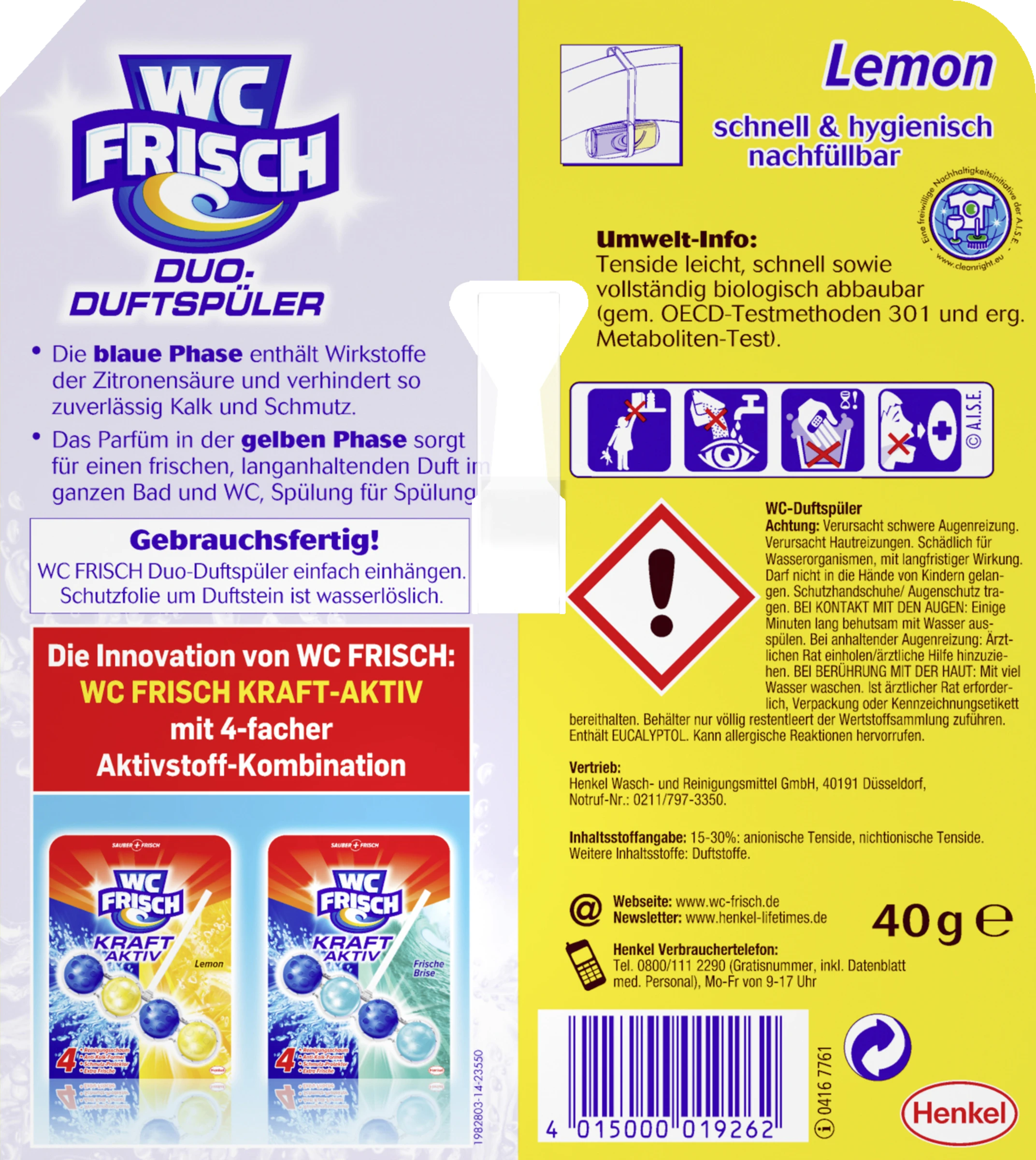 WC Frisch Duo-Duftspüler – für ein hygienisch sauberes und stets frisches WC. Eine Kombination aus einem WC-Reiniger, um Kalk und Schmutz zu bekämpfen, und einem Duftspüler, um langanhaltende Frische zu garantieren. In der gelben Kammer befindet sich das Parfüm, um für einen frischen, langanhaltenden Duft im ganzen Bad und WC zu sorgen, Spülung für Spülung. Die blaue Kammer enthält Wirkstoffe der Zitronensäure und wirkt so gegen Kalk und Schmutz. Einfach von der Seite nachfüllbar.